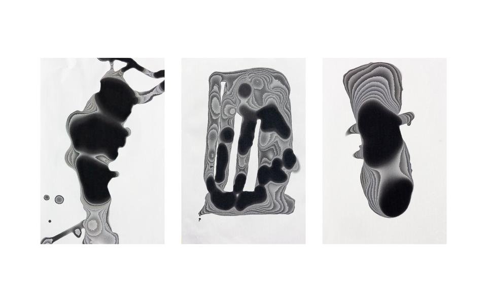 本作は筆を持った子どもが書写用教材である水かきシートに描いた模様を撮影し、制作した作品です。水を含ませた筆で描かれた模様は、時間の経過とともに乾き、やがて消えてしまいます。本作では、その乾燥の過程を一定間隔で撮影し、濡れていない部分を削除した十枚の画像を合成しました。子どもの筆の動きや模様の乾き方は、作者である撮影者や子ども自身でさえ完全には制御できません。私はあえて制御できない制作方法を選ぶことで、偶然性を含んだ新しい表現が成立すると考えました。