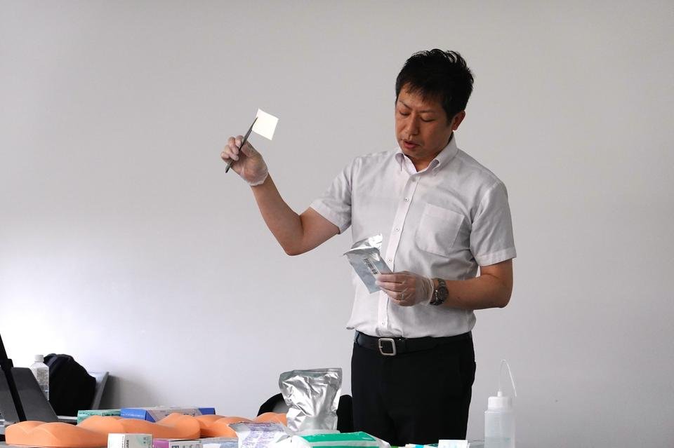 講師として一般財団法人上越市地域医療機構 上越地域医療センター病院 薬局長 宮川哲也先生に指導いただき、褥瘡の薬物治療を効果的に実践するために、薬剤および医療材料の基礎知識と皮膚特性に基づく薬剤を褥瘡内に滞留させるためのスキルについて学びました。
