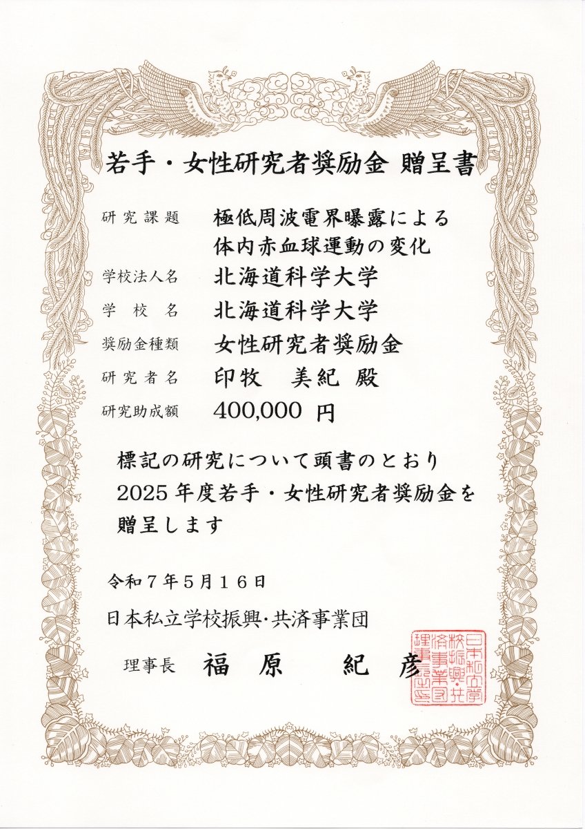 この助成金は、将来の研究を担う若手・ 女性研究者の研究活動を奨励・支援することを目的としたもので、 全国の私立大学の中から将来性ある優れた研究に取り組む研究者が選ばれる、大変名誉ある助成です。