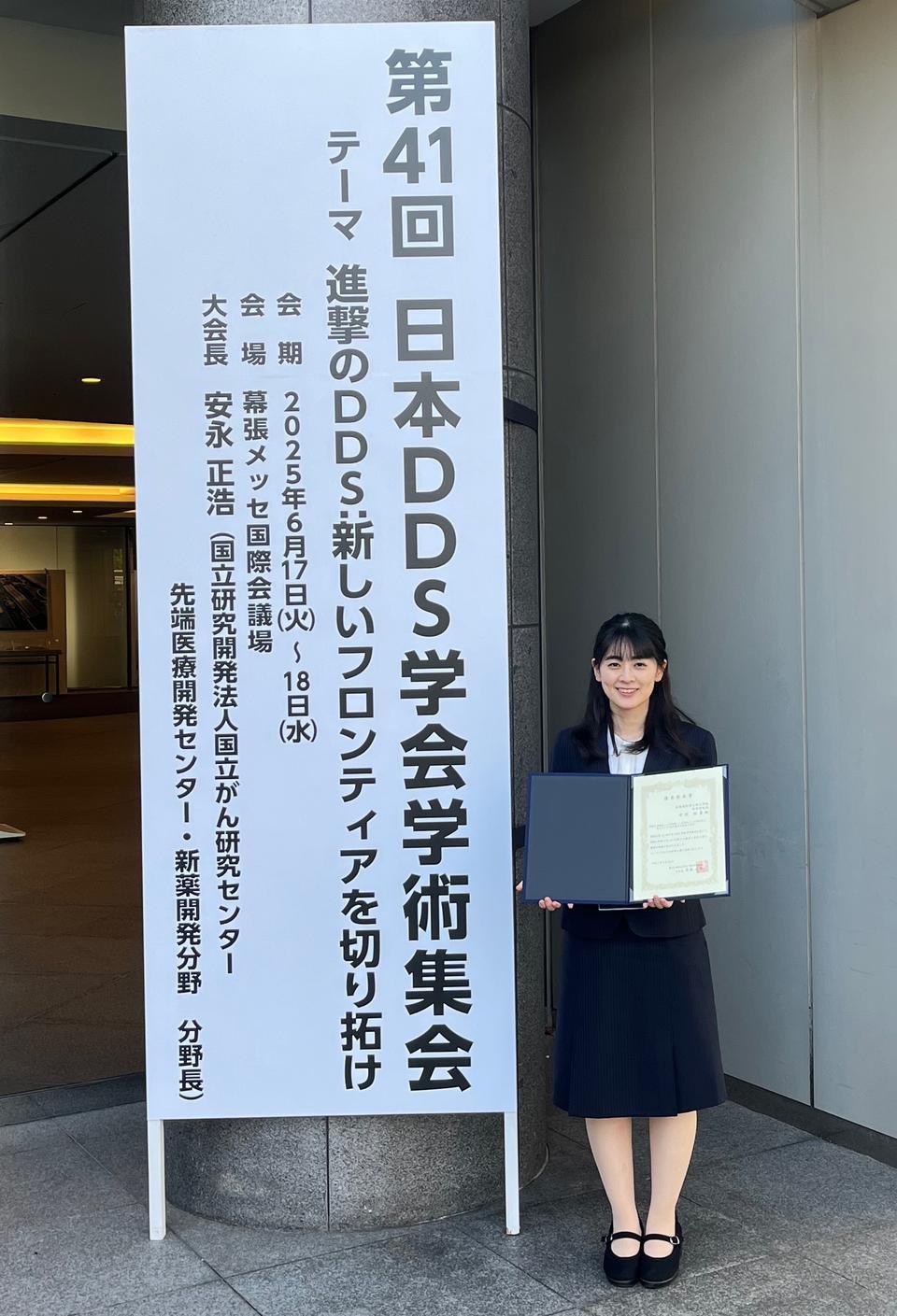 この賞は、薬学、医学、 工学など幅広い分野の研究者が日本国内外から集うドラッグデリバ リーシステム(DDS)の学術集会において、 優れた研究成果について発表した研究者に授与されるものです。