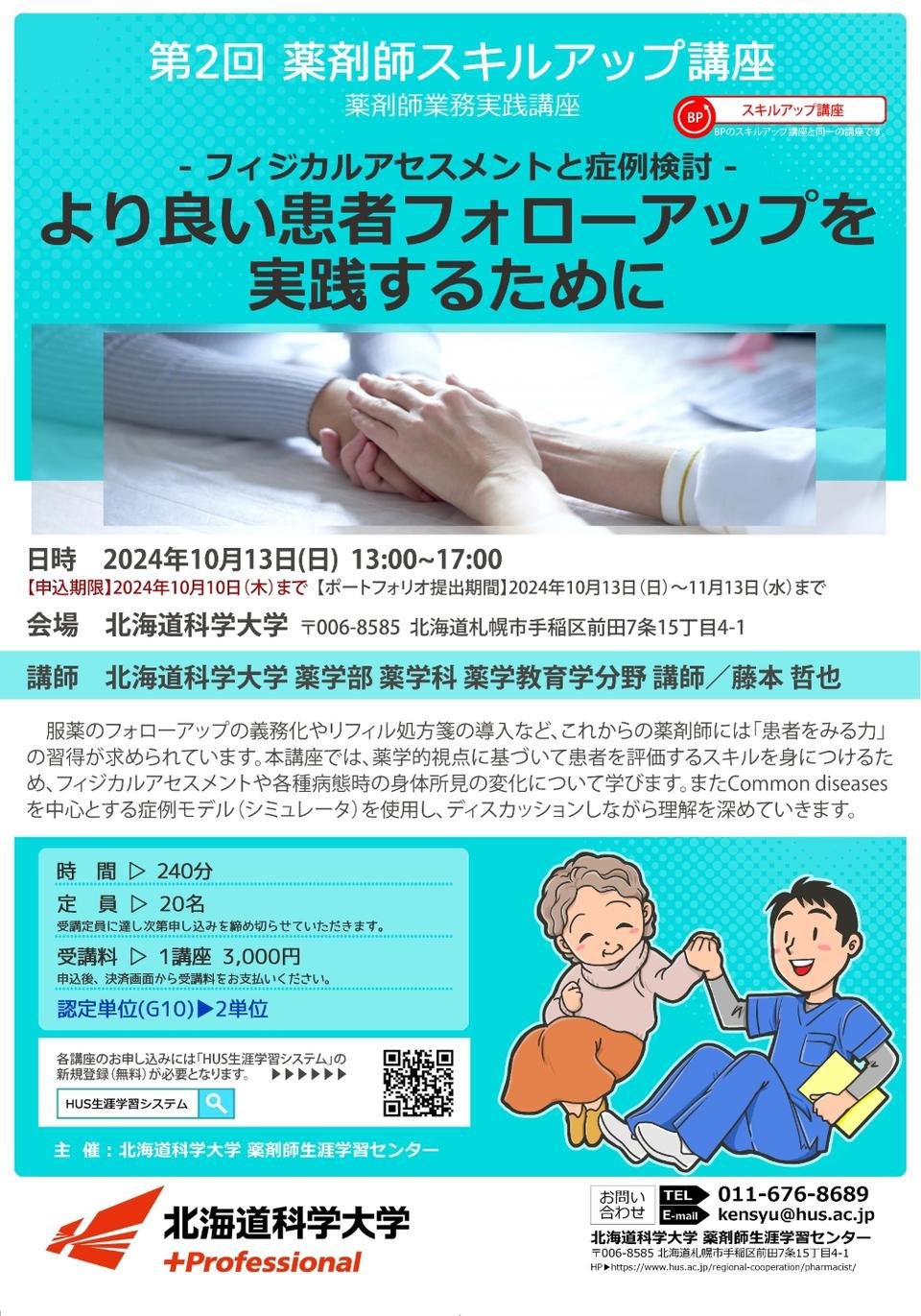 2024年10月13日(日)、北海道科学大学 薬剤師生涯学習センター主催講座【第2回 薬剤師スキルアップ講座(薬剤師業務実践講座)】を開催いたします。