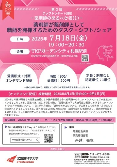 2025年7月18日(金)、北海道科学大学 薬剤師生涯学習センター主催講座【第2回薬剤師アップトゥデート講座】を開催いたします。