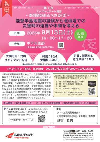 2025年9月13日(土)、北海道科学大学 薬剤師生涯学習センター主催講座【第3回薬剤師アップトゥデート講座】を開催いたします。