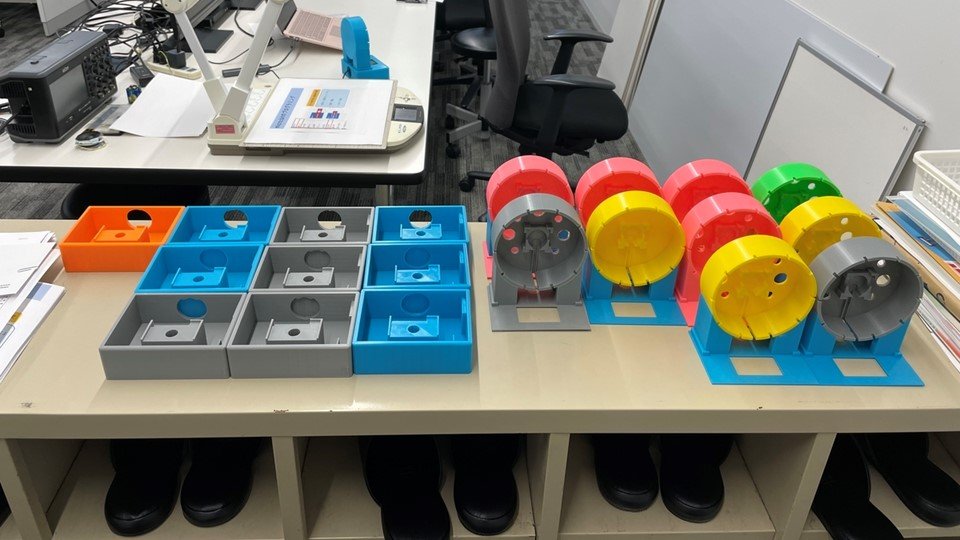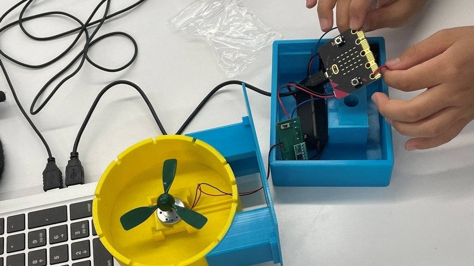 今回はmicro:bitと内蔵の温度センサーを用いて、設定温度以上になったらプロペラが回る、センサー付きミニ扇風機を作製します。扇風機用のプロペラと全体のケースは、同じく木村研究室大学院生の小向さんが、3Dプリンタを使って参加者全員分を作ってくれました。