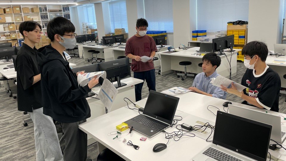 大学側の学生スタッフは小向さん(電気電子専攻修士1年)、長谷川さん(電気電子4年)、内田さん(電気電子4年)、加賀さん(電気電子2年)および今回の中心となる安田さん(電気電子専攻修士2年)、そして木村教授の6名です。