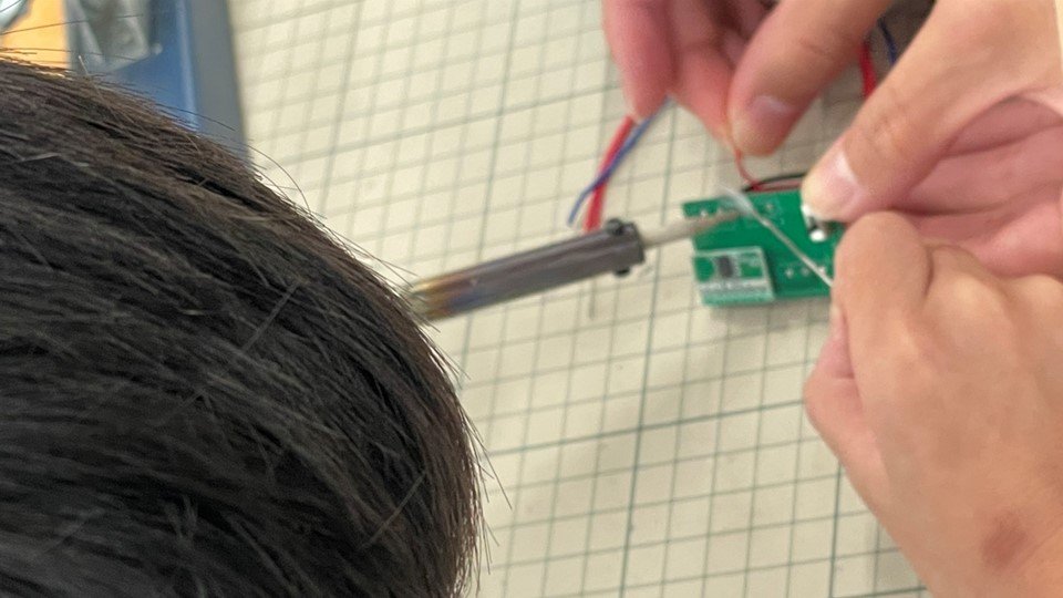ここで休憩をはさんで、後半は工作を進めます。ただし実際は込み入った作業もあり、すべてを自分で行ってもらうとするとかなり時間がかかる見込み。そのため今回、基板をあらかじめ発注して作製、ある程度の配線は事前に安田さんが済ませました。当日は数箇所だけ参加者自身ではんだ付けを行ってもらいました。
