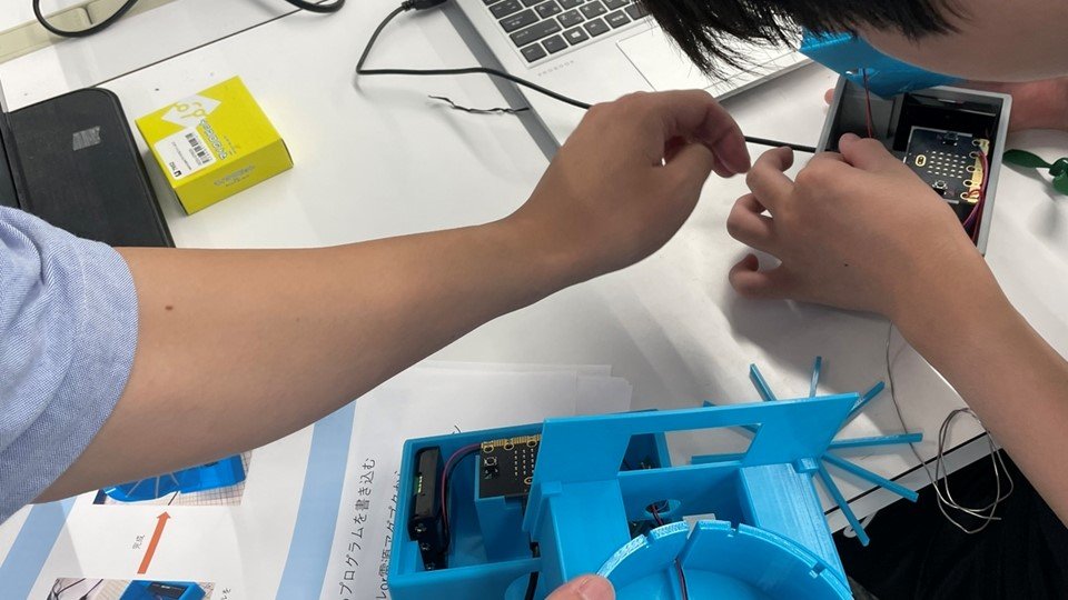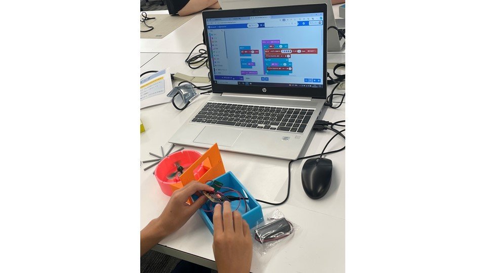 その後、ケースにモータ、基板、micro:bitを組み込んで、プログラムをmicro:bitにダウンロード。全員がほぼ順調に完成させることができました。