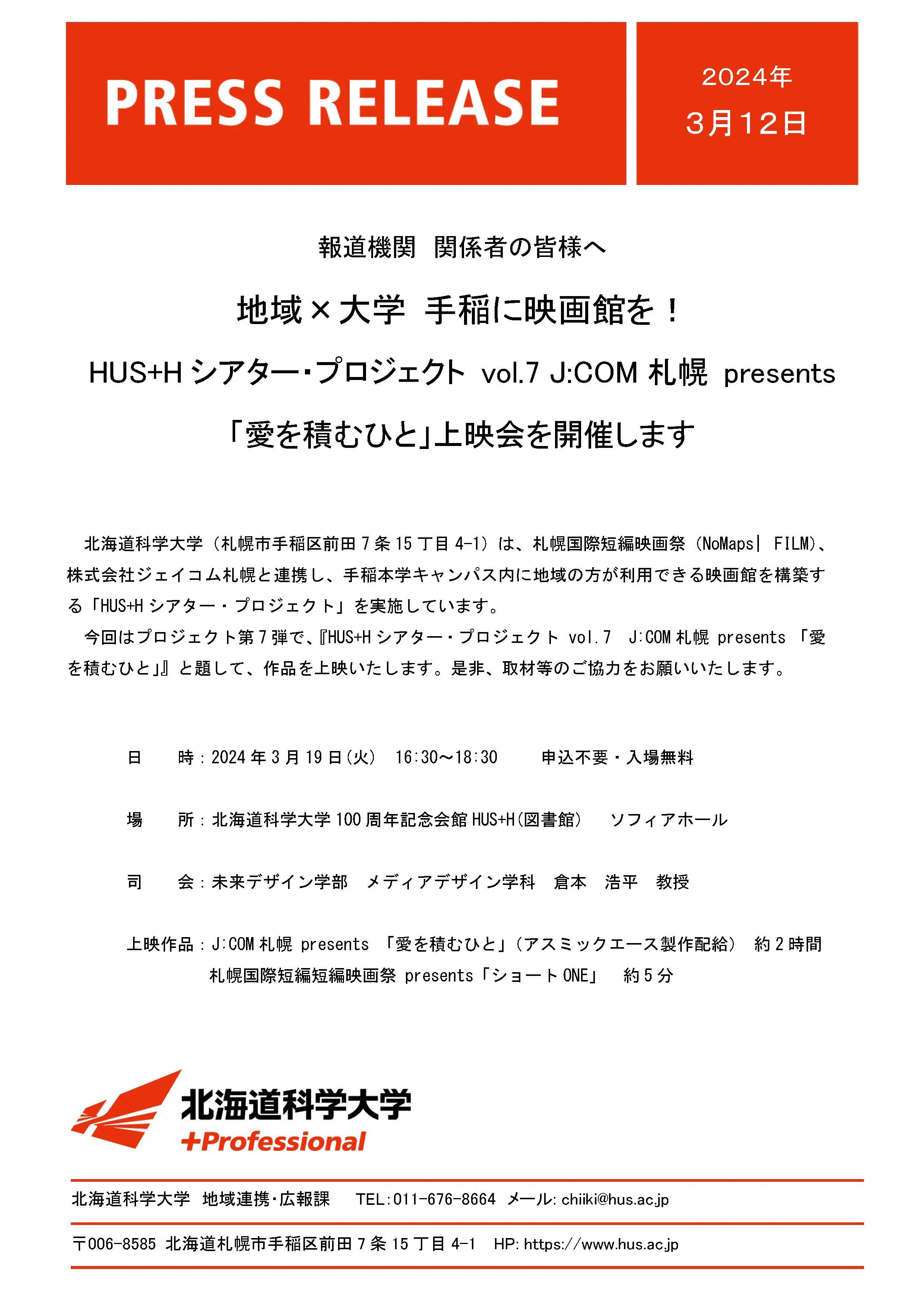 今回はプロジェクト第7弾で、『HUS+Hシアター・プロジェクト vol.7 J:COM札幌 presents 「愛を積むひと」』と題して、作品を上映いたします。是非、取材等のご協力をお願いいたします。