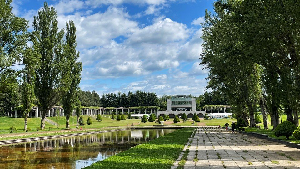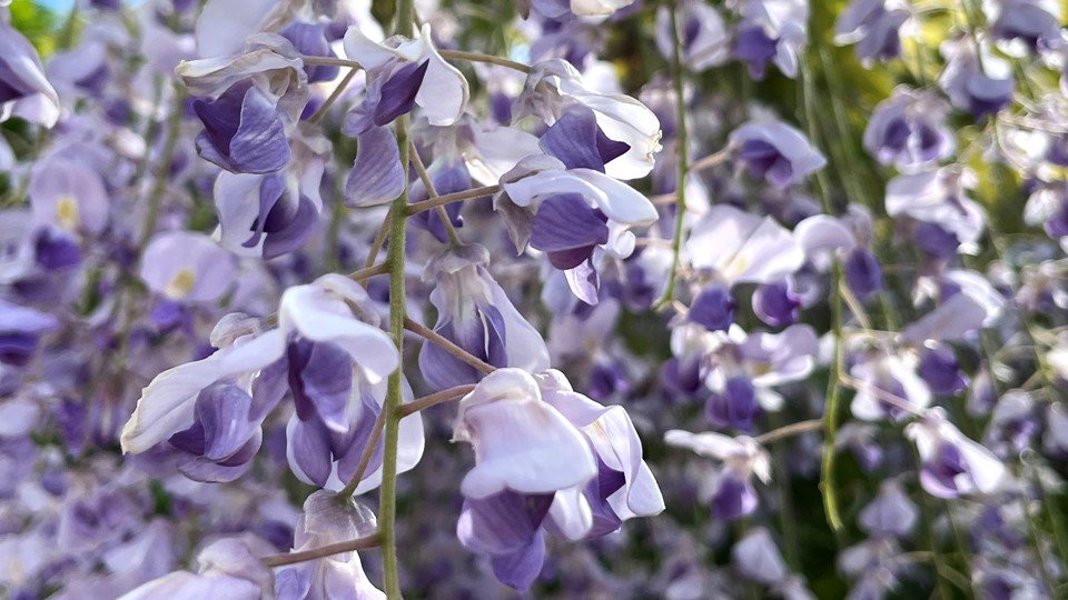 早朝は清々しい青空でした。広大な園内は、藤の花の甘い香りに包まれ、展望ラウンジ、大パーゴラ、サンクガーデンの景色に薄紫の帯が映えています。