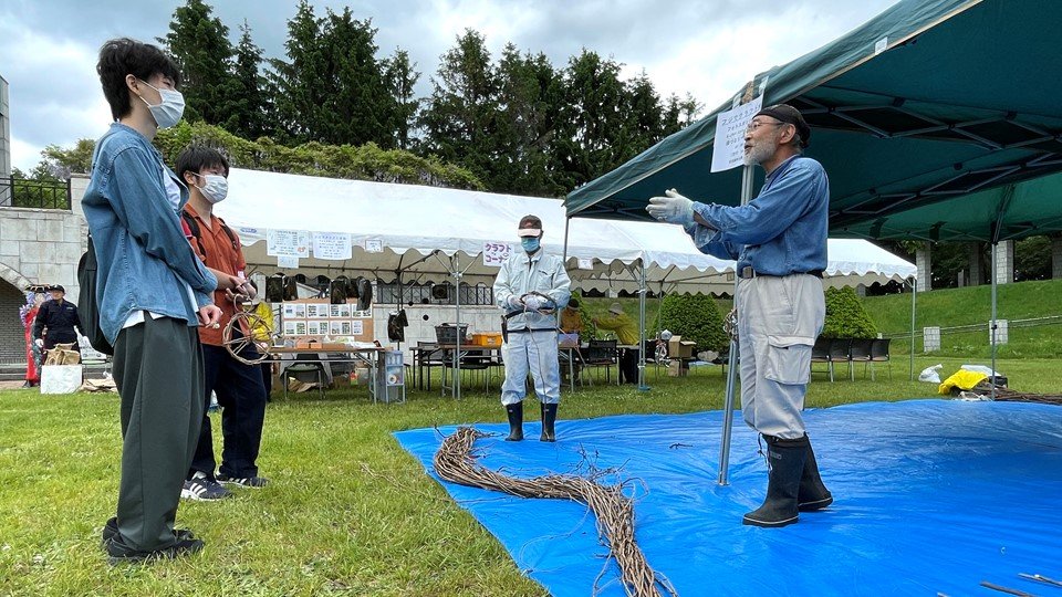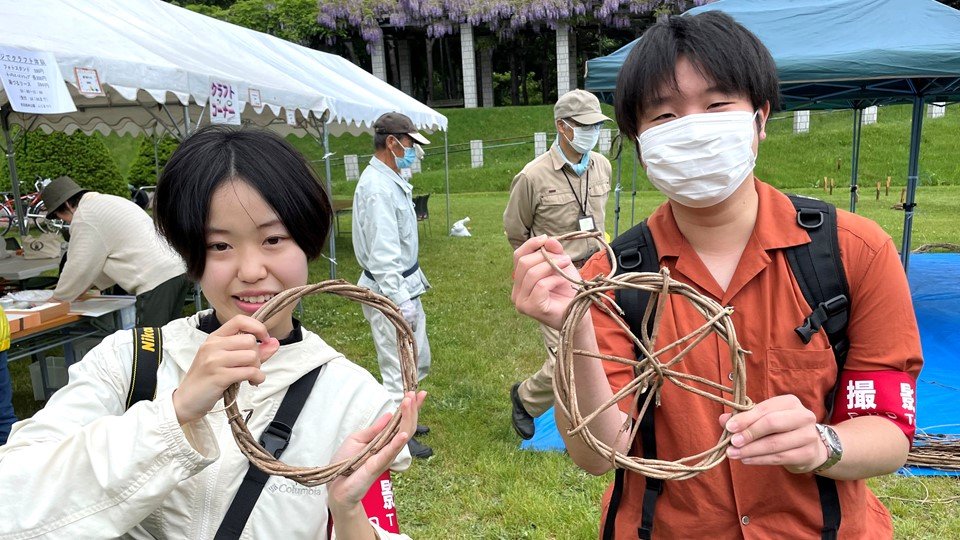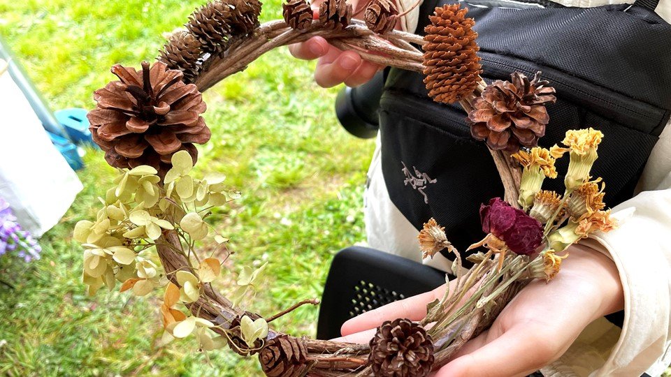 同公園で剪定された藤のツルを使ったリースづくり、手稲区内の公園で採取された松ぼっくりやドライフラワーなどを飾るワークショップにも参加。
