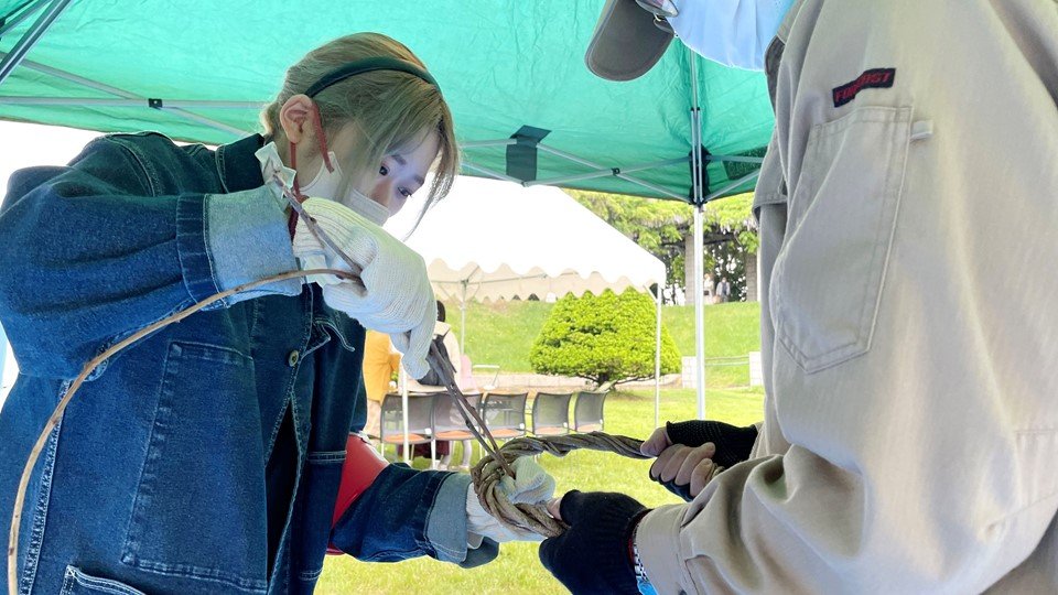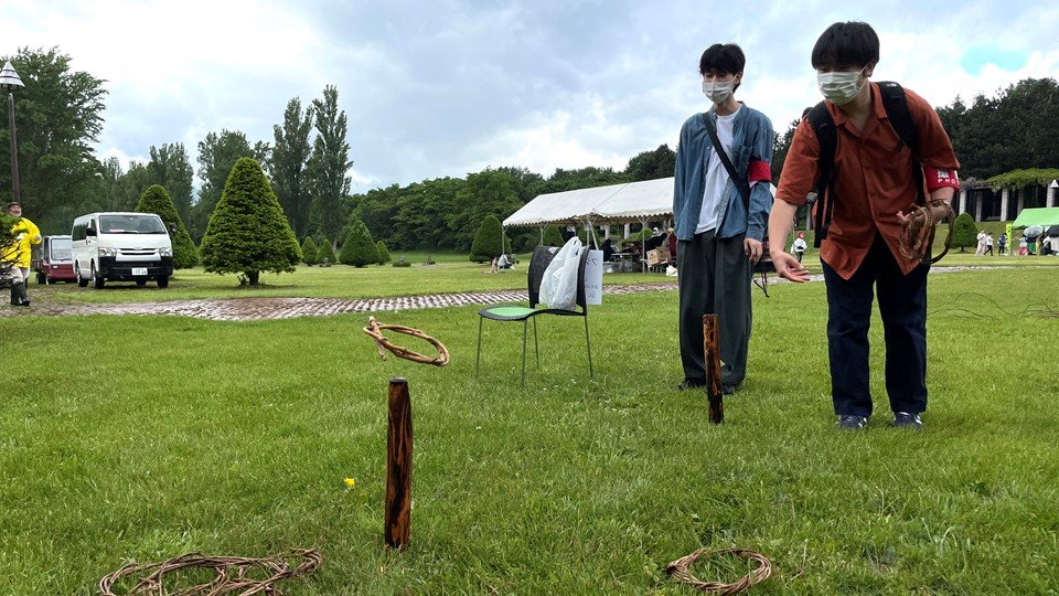 剪定された木々を使った輪投げの体験も。藤のツルで作られた輪っかは、どこに飛んでいくのかわからないので、何度チャレンジしても杭をとらえられません。