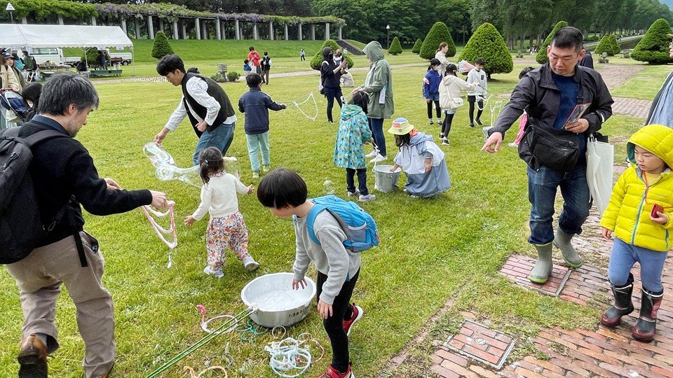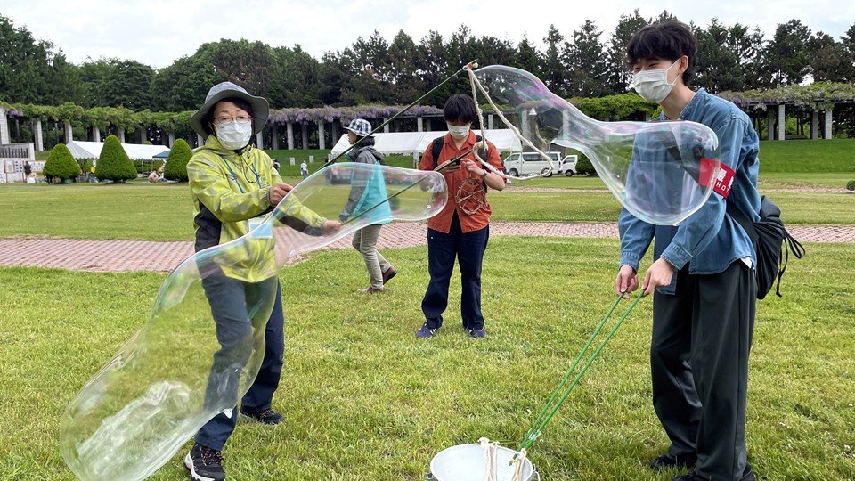 特製のシャボン液と輪っかを使って、巨大シャボン玉作りに熱中します。巨大なシャボン玉がふわふわと舞い上がると歓声があがります。