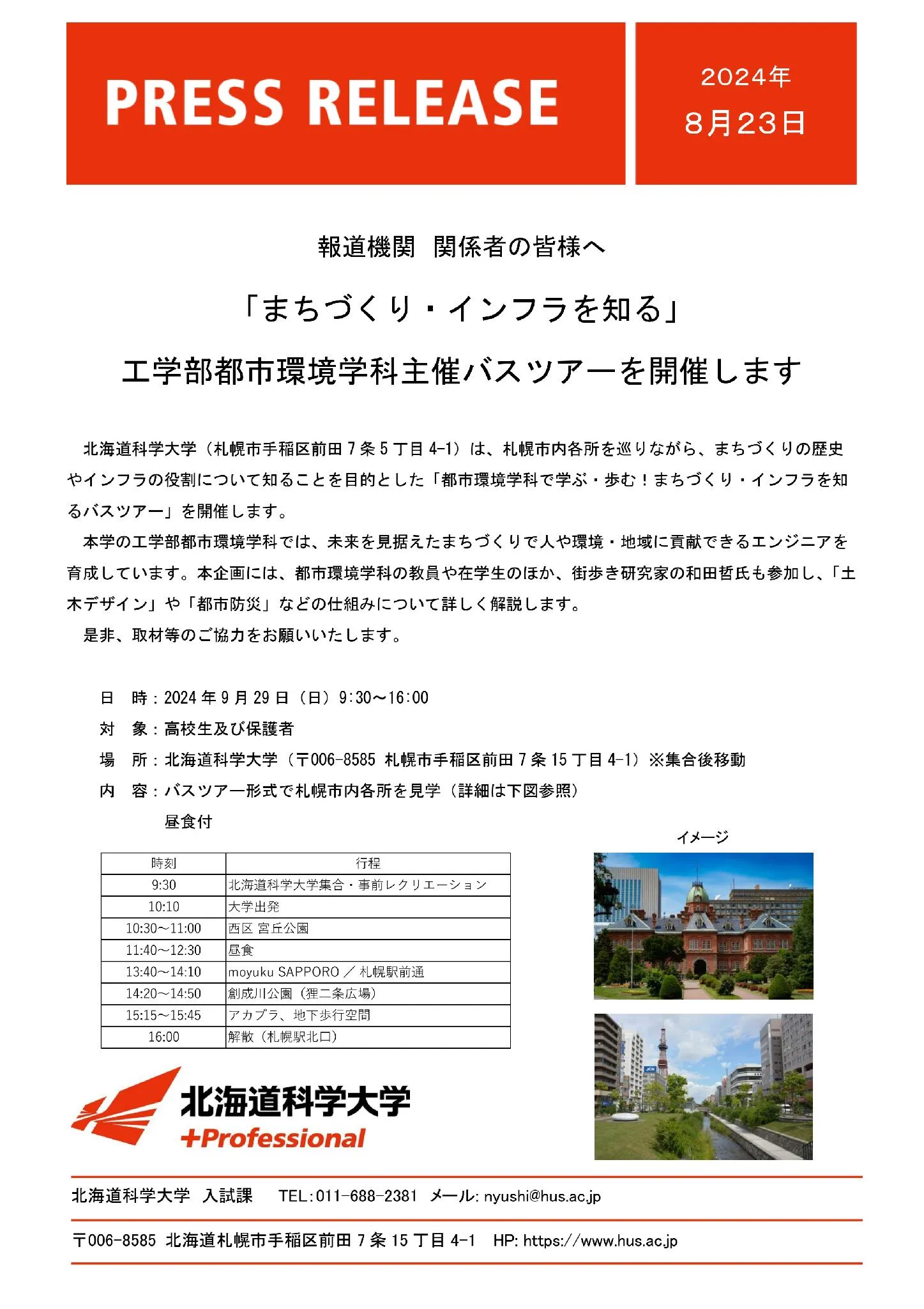 北海道科学大学(札幌市手稲区前田7 条5 丁目4-1)は、札幌市内各所を巡りながら、まちづくりの歴史やインフラの役割について知ることを目的とした「都市環境学科で学ぶ・歩む!まちづくり・インフラを知るバスツアー」を開催します。