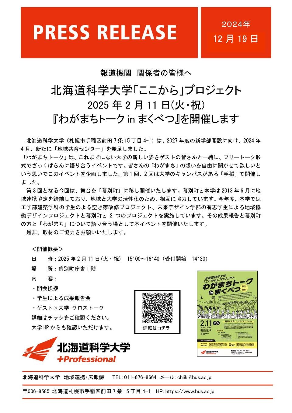北海道科学大学「ここから」プロジェクト 『わがまちトークinまくべつ』を開催します|プレスリリース