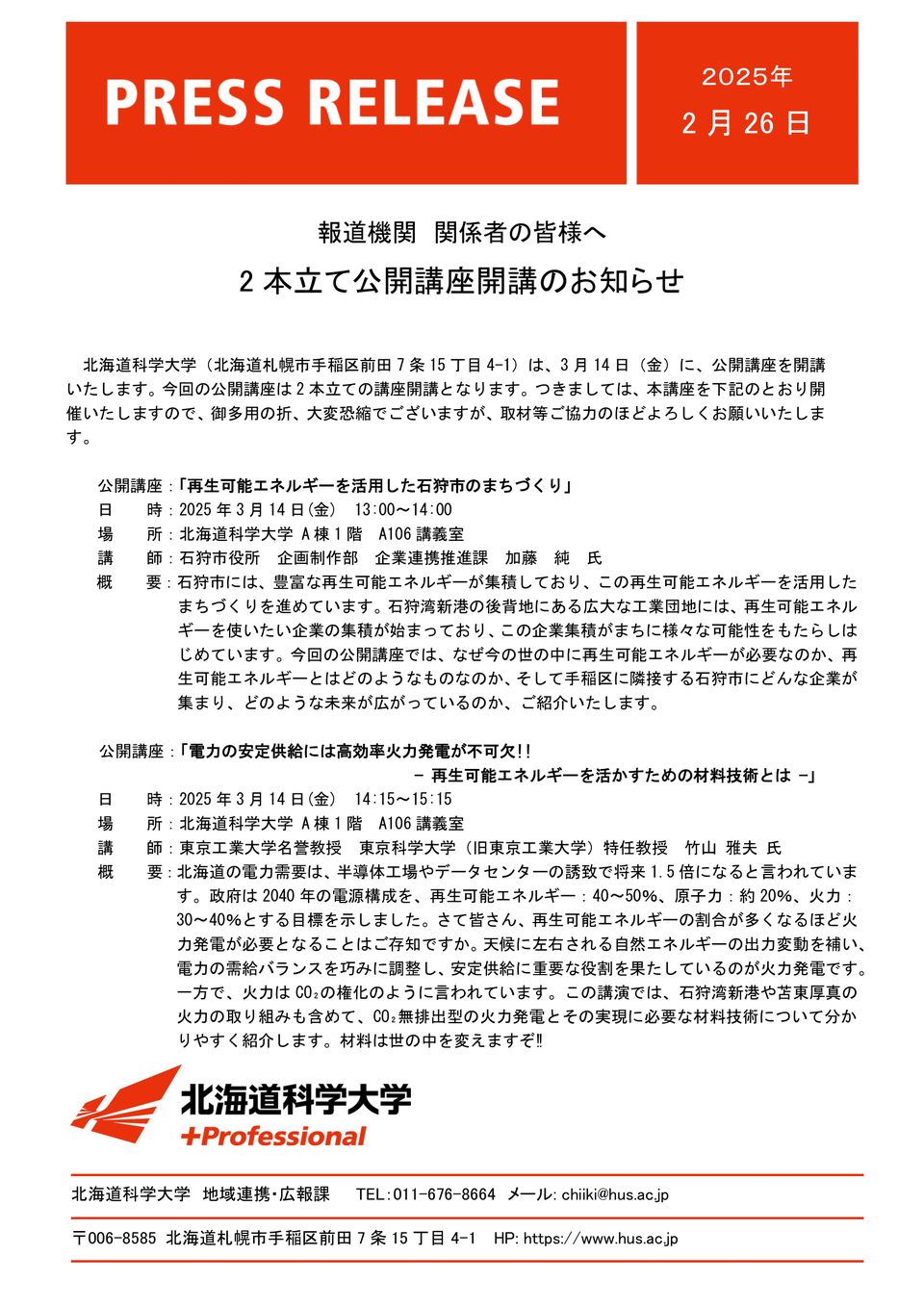 北海道科学大学(北海道札幌市手稲区前田7条15丁目4-1)は、3月14日(金)に、公開講座を開講いたします。今回の公開講座は2本立ての講座開講となります。つきましては、本講座を下記のとおり開催いたしますので、御多用の折、大変恐縮でございますが、取材等ご協力のほどよろしくお願いいたします。