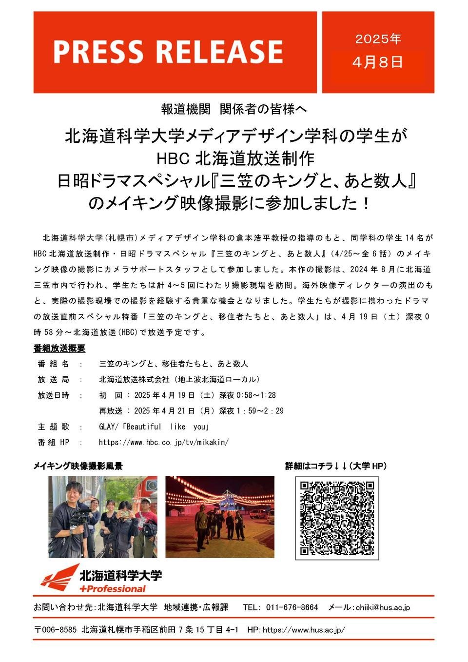 本作の撮影は、2024年8月に北海道三笠市内で行われ、学生たちは計4~5回にわたり撮影現場を訪問。海外映像ディレクターの演出のもと、実際の撮影現場での撮影を経験する貴重な機会となりました。学生たちが撮影に携わったドラマの放送直前スペシャル特番「三笠のキングと、移住者たちと、あと数人」は、4月19日(土)深夜0時58分~HBC北海道放送で放送予定です。