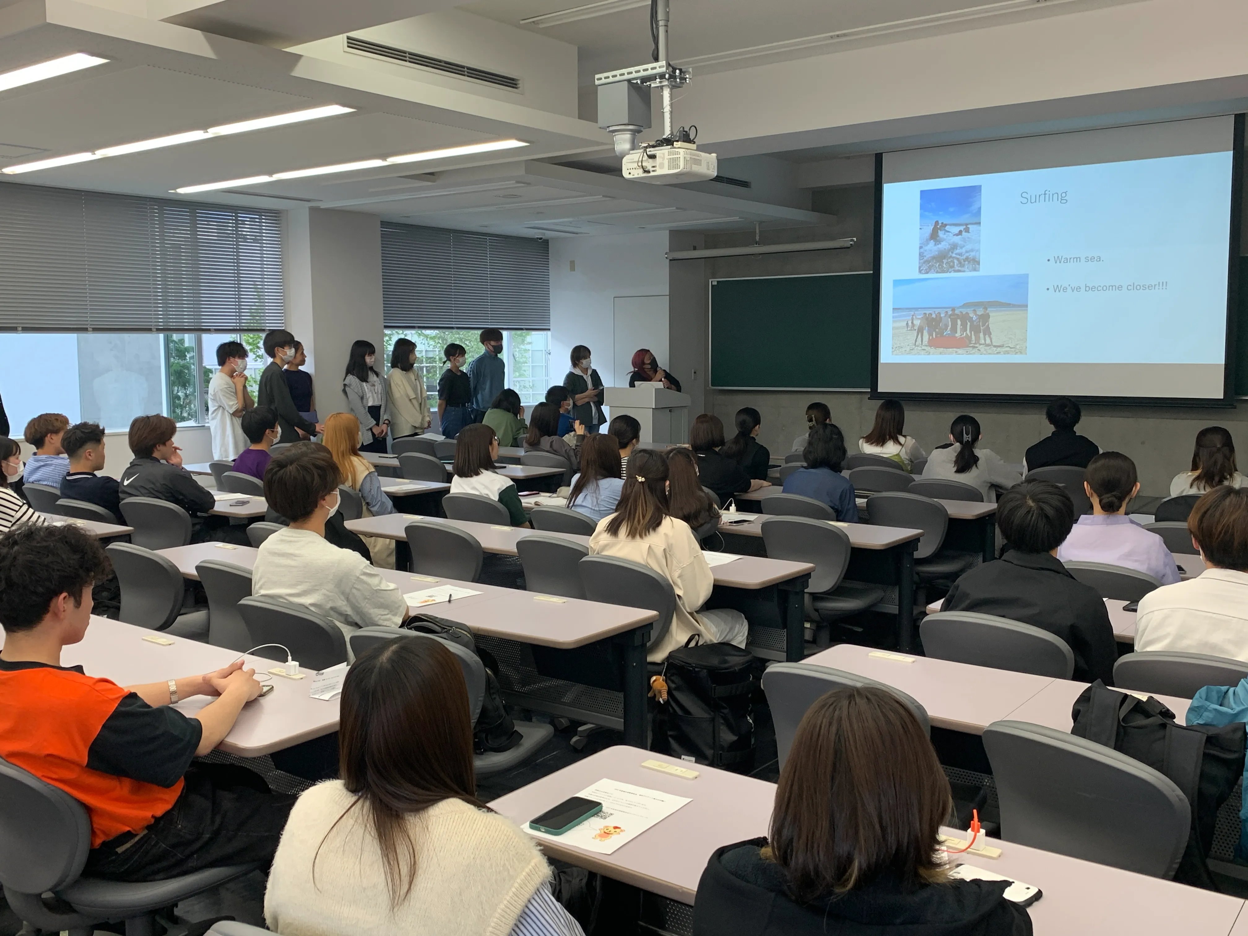 サザンクロス大学で受講した英語クラスの内容や参加した大学イベントについて、ミニクイズを交えながらの報告となりました。続いて2週間一緒に過ごしたホストファミリーと思い出についてのお話と、サーフィンレッスンやビラボン動物園などのアクティビティについて報告をしました。