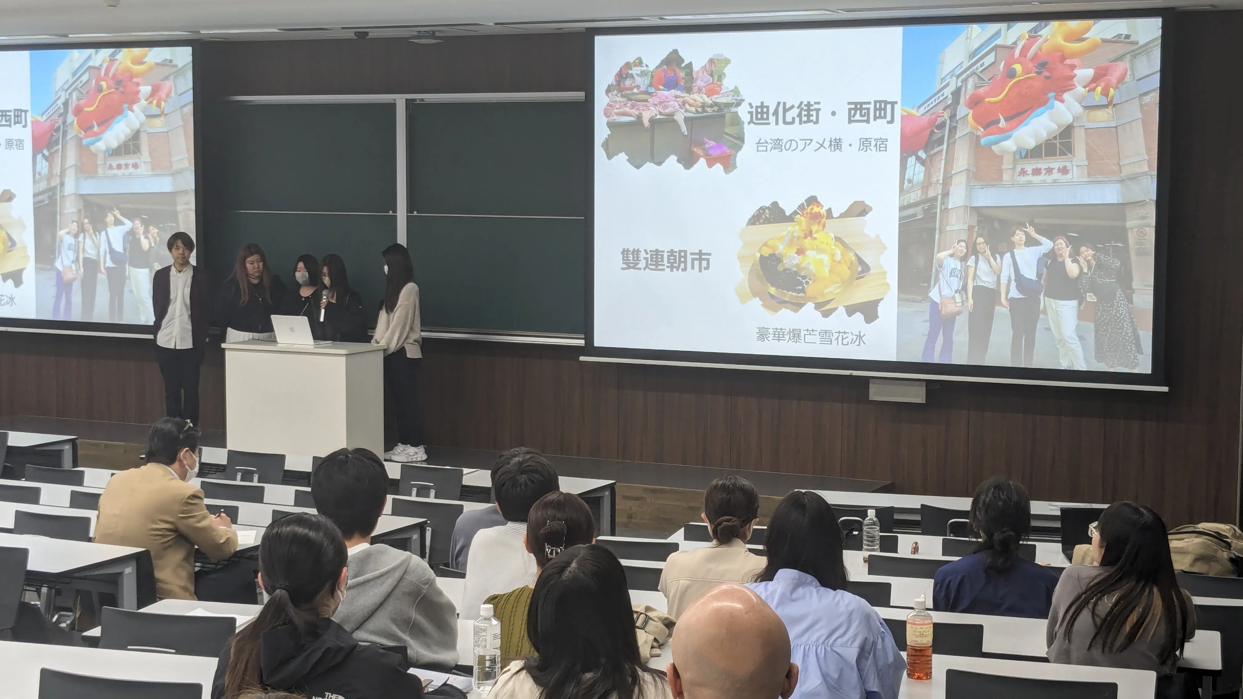 「台湾学生交流研修」の報告では、台北にある淡江大学の学生たちと交流し将来の夢について話し合ったり、淡江周辺を一緒に散策して親睦を深めたほか、