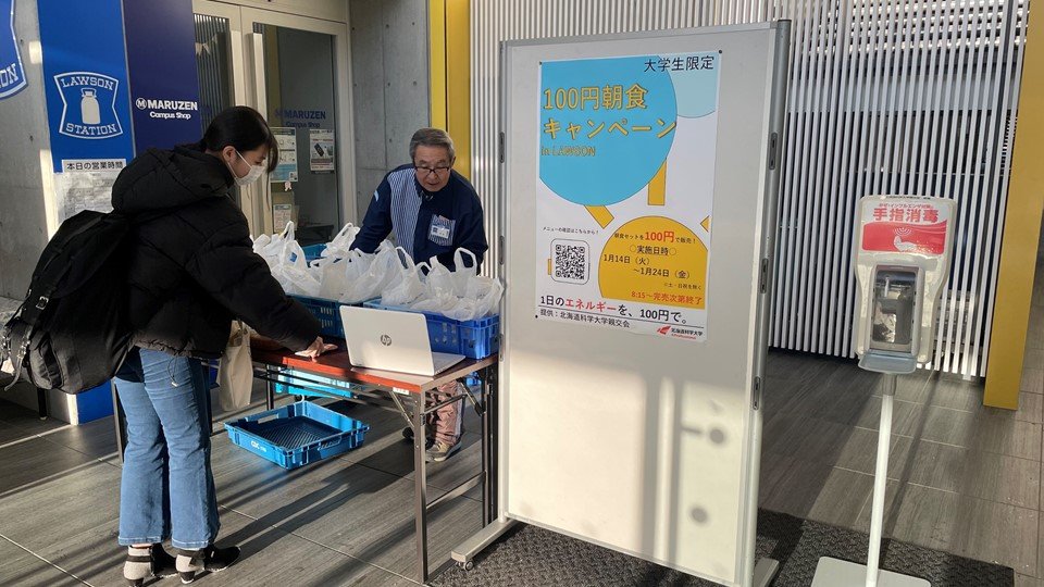 今回は北海道科学大学親交会の支援によりLAWSONの朝食セットを100円で販売しています。