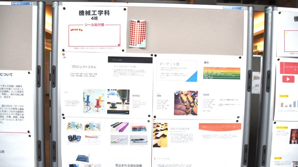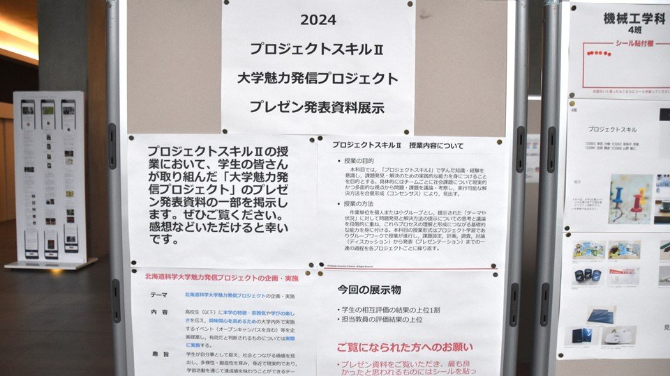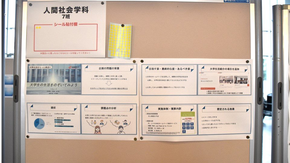 プロジェクトスキルⅡの大学魅力発信プロジェクトにおいて学生が作成したプレゼン資料を展示しました