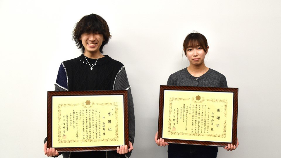 薬学科4年生 林 由依翔さんと薬学科3年生 山崎 鈴奈さんがアルバイト勤務先で特殊詐欺防止し手稲警察署から感謝状を授与されました