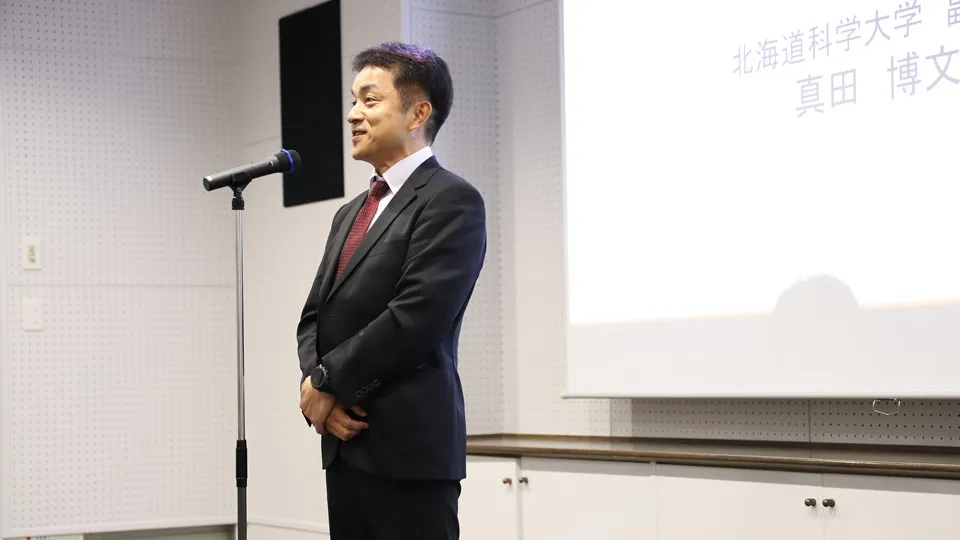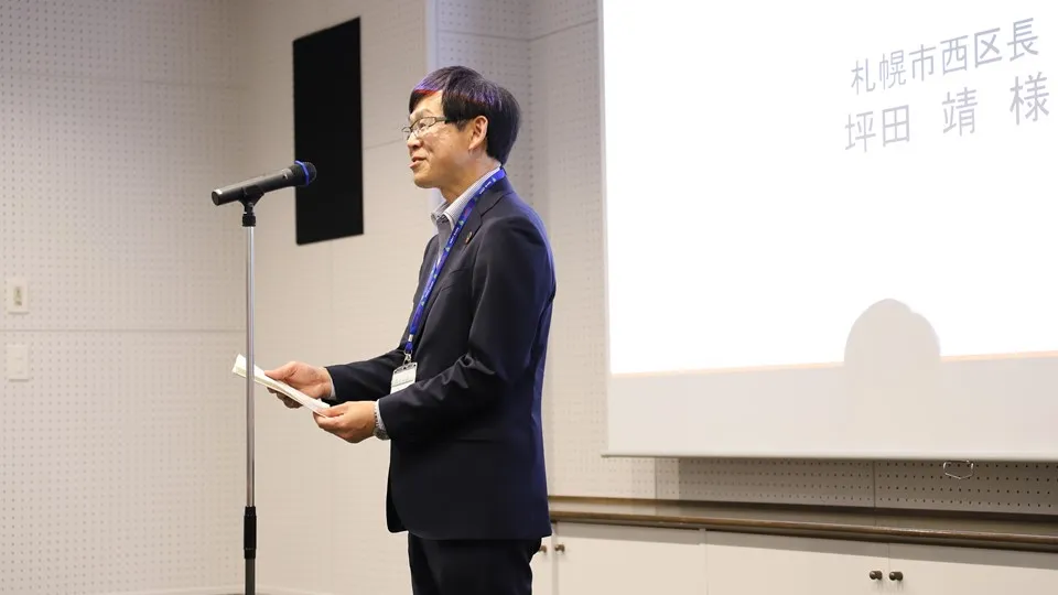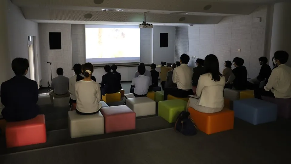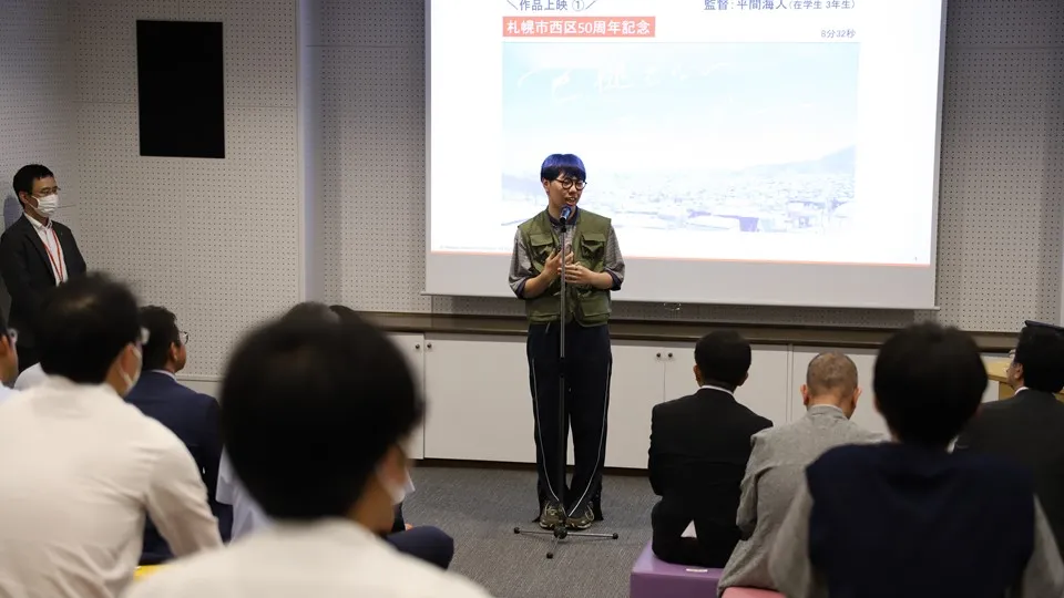 こちらの作品は札幌市西区のさまざまな魅力を改めて発信し、次なる50年も西区に住み続けたいと思ってもらえるような記念動画を目指し制作したものとなり、当日は監督・脚本を担当したメディアデザイン学科 3年 平間海人さんから制作時について紹介いただきました。