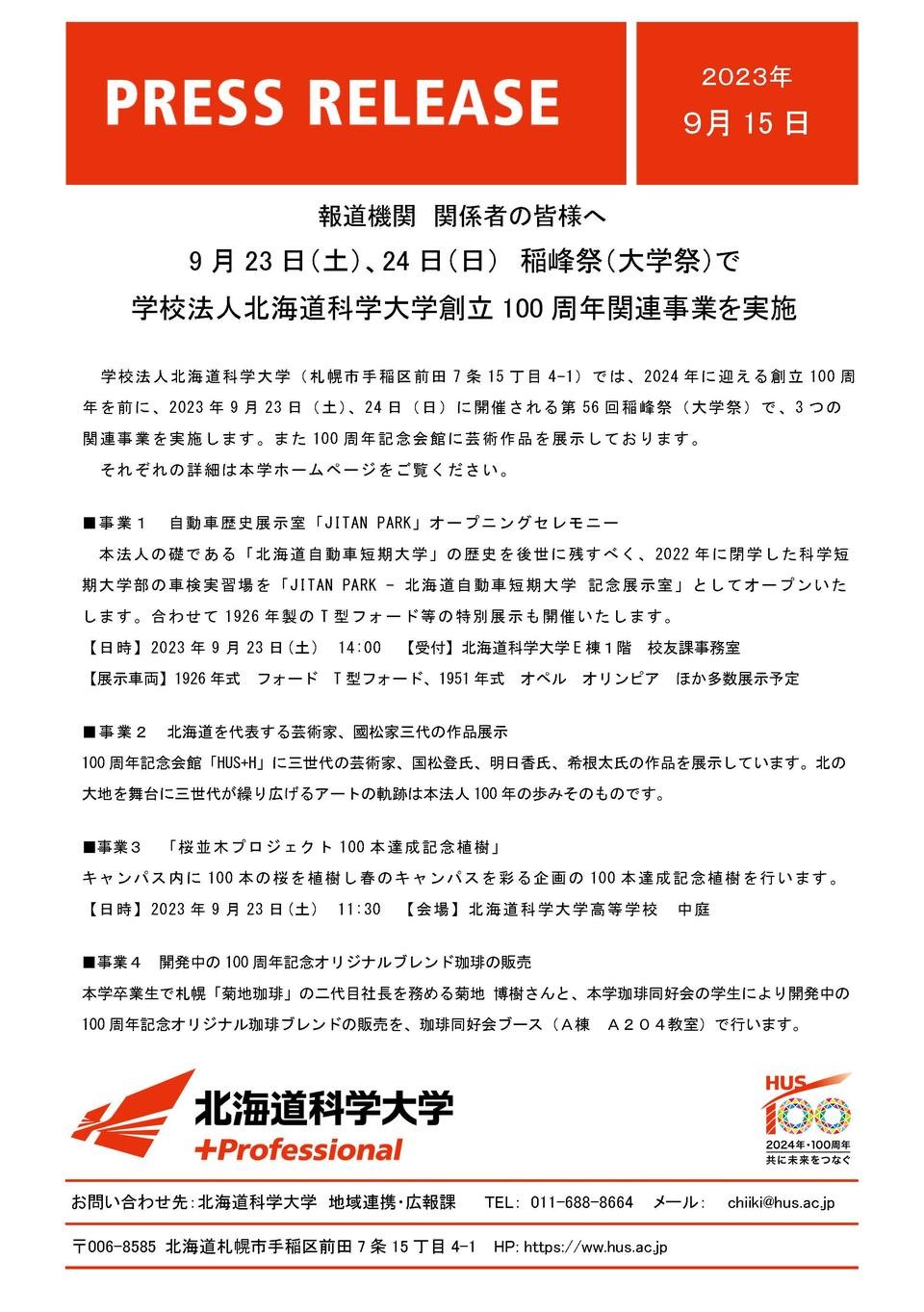 学校法人北海道科学大学(札幌市手稲区前田7条15丁目4-1)では、2024年に迎える創立100周年を前に、2023年9月23日(土)、24日(日)に開催される第56回稲峰祭(大学祭)で、3つの関連事業を実施します。また100周年記念会館に芸術作品を展示しております。 それぞれの詳細は本学ホームページをご覧ください。