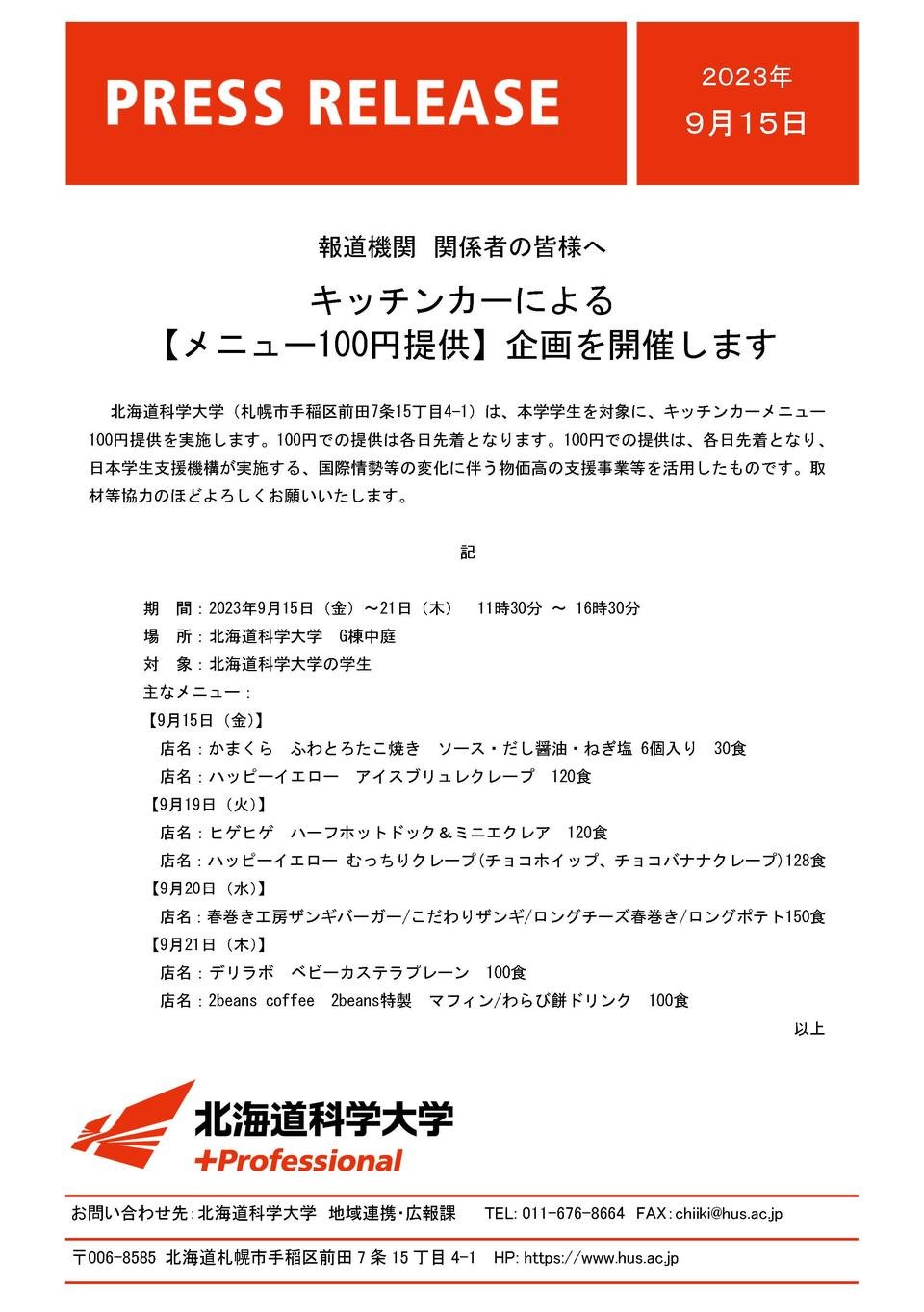 北海道科学大学(札幌市手稲区前田7条15丁目4-1)は、本学学生を対象に、キッチンカーメニュー100円提供を実施します。100円での提供は各日先着となります。100円での提供は、各日先着となり、日本学生支援機構が実施する、国際情勢等の変化に伴う物価高の支援事業等を活用したものです。取材等協力のほどよろしくお願いいたします。