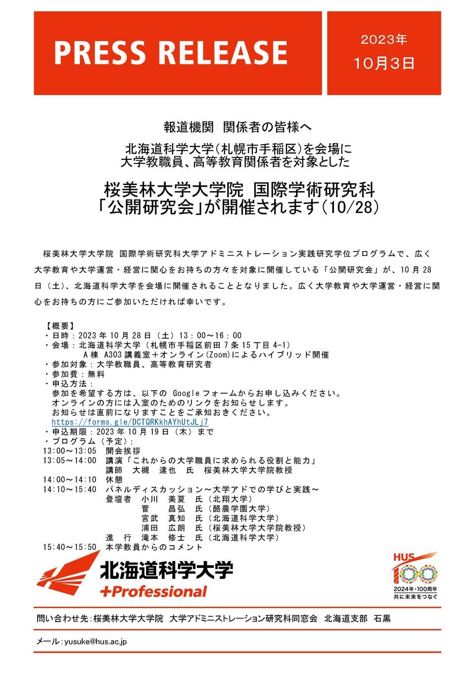 桜美林大学大学院 国際学術研究科大学アドミニストレーション実践研究学位プログラムで、広く大学教育や大学運営・経営に関心をお持ちの方々を対象に開催している「公開研究会」が、10月28日(土)、北海道科学大学を会場に開催されることとなりました。広く大学教育や大学運営・経営に関心をお持ちの方にご参加いただければ幸いです。