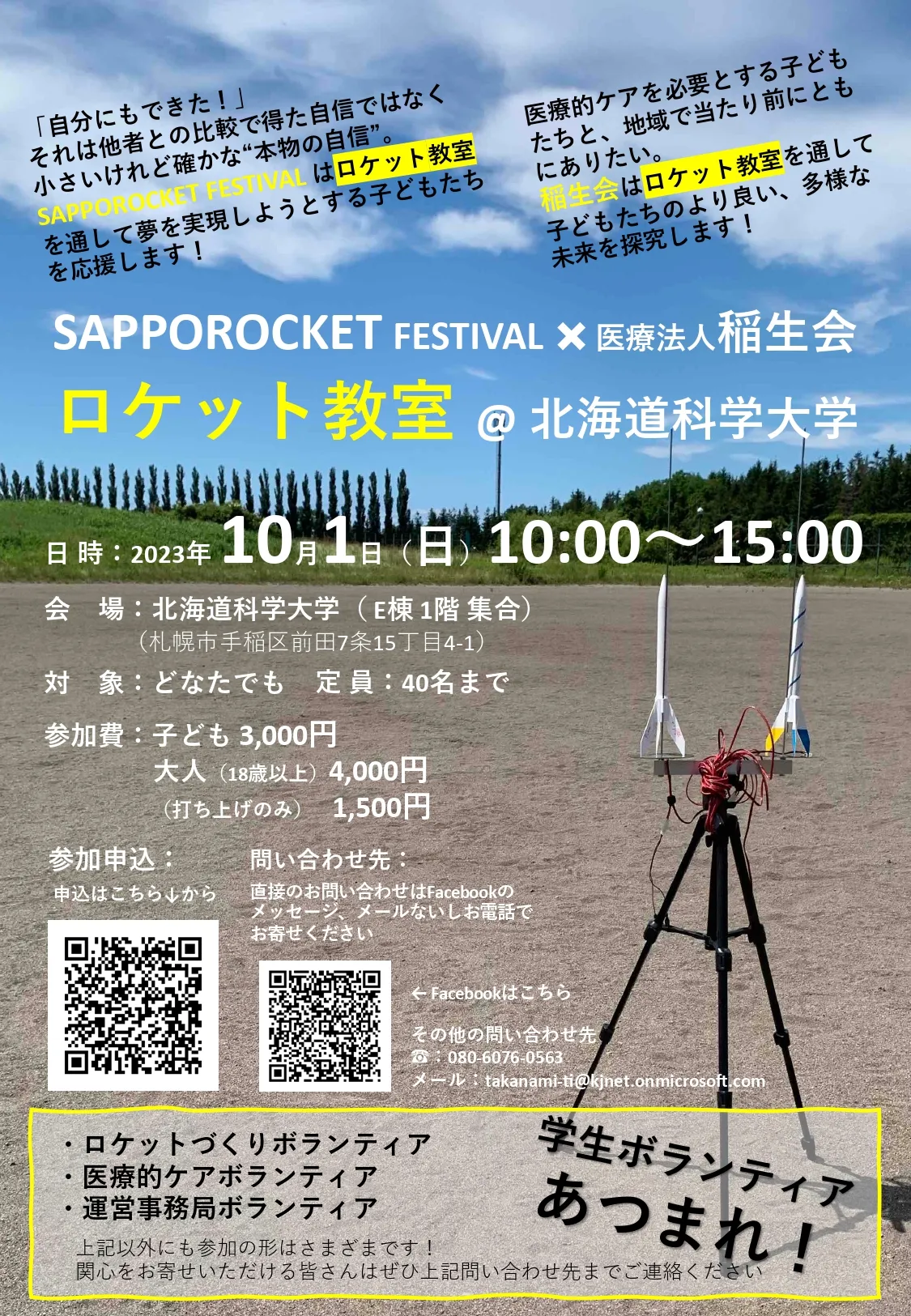 2023年10月1日(日)にSAPPOROCKET FESTIVAL×医療法人稲生会共催の「ロケット教室」を本学の多目的グラウンドで実施します