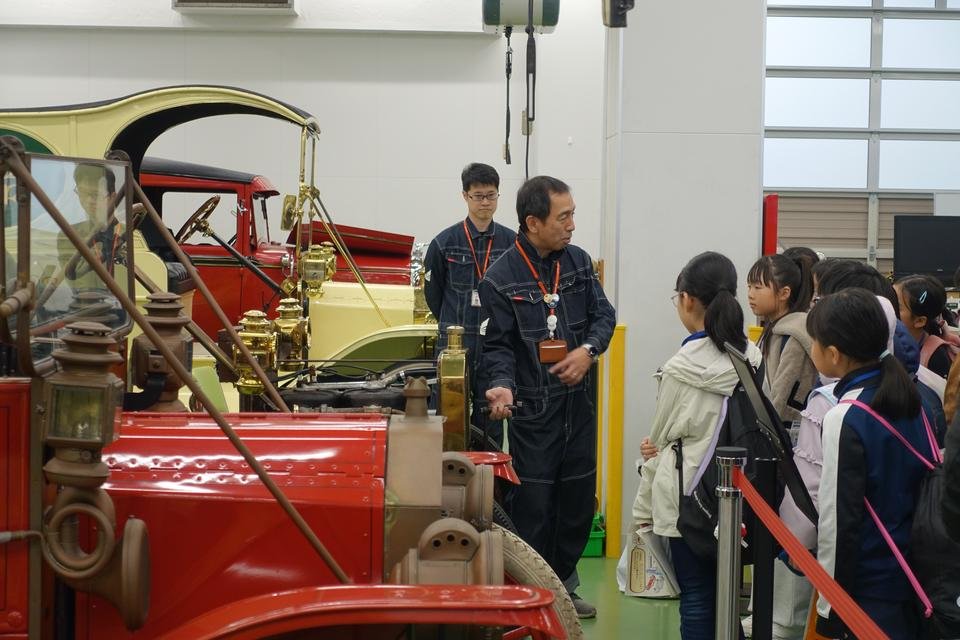 見学後には、T型フォードの前で記念撮影を行い、100年前の自動車の存在を肌で感じる貴重な体験となりました。