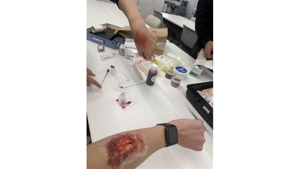 訓練に先立ち、ムラージュ(特殊メイク)を用いた怪我の再現練習も行い、当日は病院の看護師の方々の指導のもと、非常に本格的なムラージュを施してもらうことができました。
