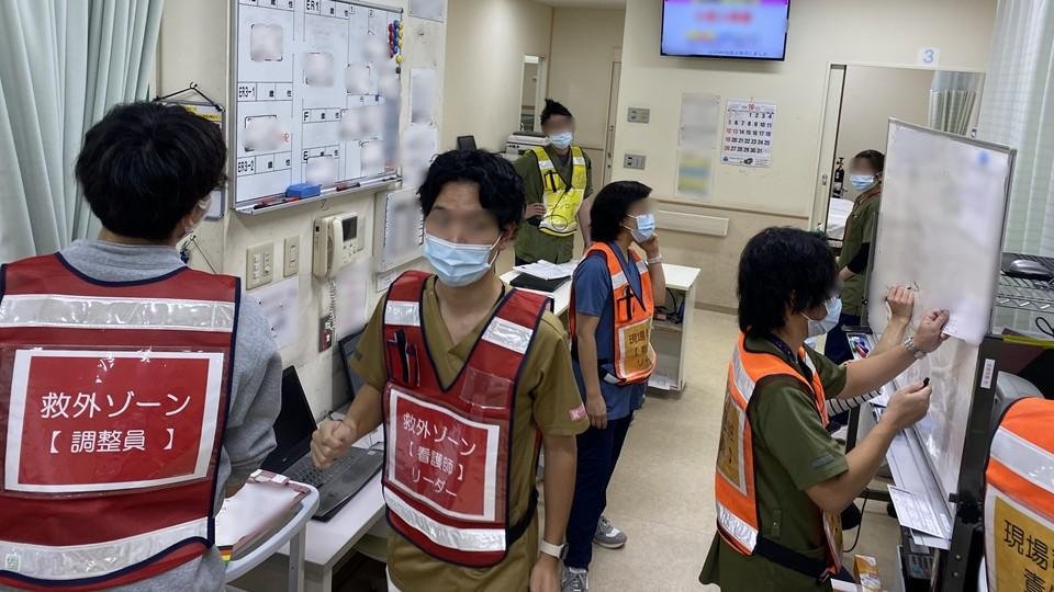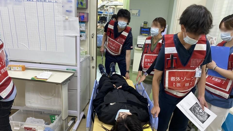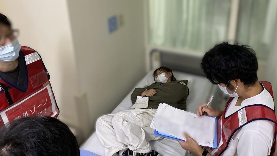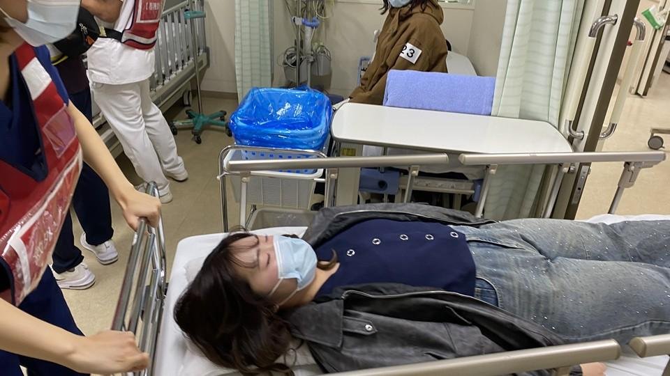 今回の訓練は、列車事故を想定し、多数傷病者が発生する状況を再現。学生たちは、傷病者役および家族役として、救急車で搬送される重症患者や自家用車で来院した傷病者を演じました。