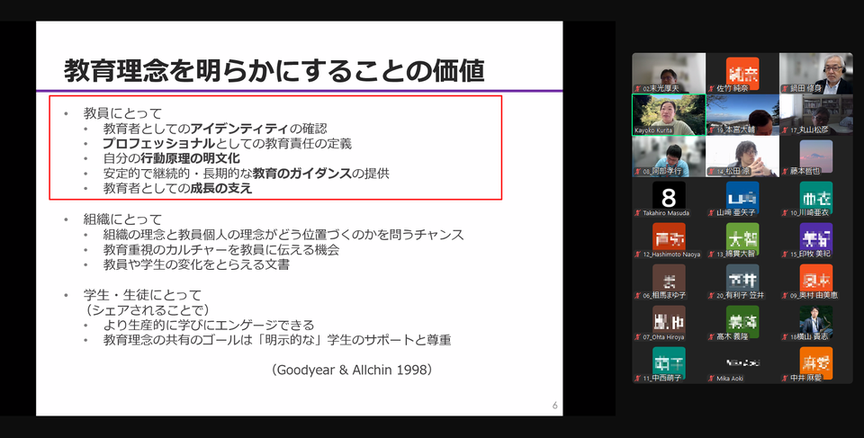 ワークショップ後のアンケートには、「事前準備含め大変だったが自身にとって必要な内容であった」、「自分自身の教育の理念など言語化することができる良い機会となった」等の感想が寄せられました。
