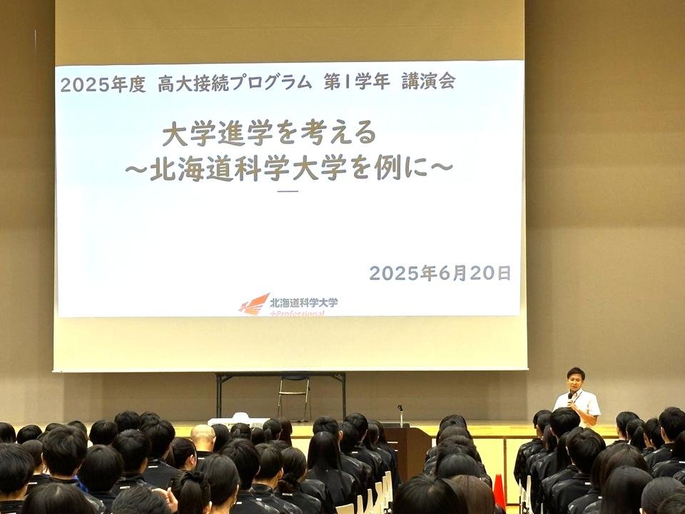 2025年6月20日(金)に、高大接続プログラムの一環として、北海道科学大学高校の1年生に向けた進路講演会を実施しました。