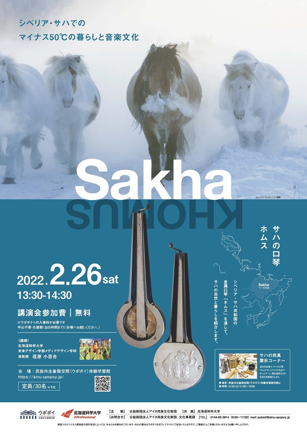「サハの口琴-シベリア・サハでのマイナス50℃の暮らしと音楽文化-」と題したこの講演会は、アイヌ文化の理解促進と、アイヌ文化のみならず新たな伝統・文化の創造や伝承につなげるため、国内外の伝統文化等を紹介するもので、本学と公益財団法人アイヌ民族文化財団の共催で開催されました。