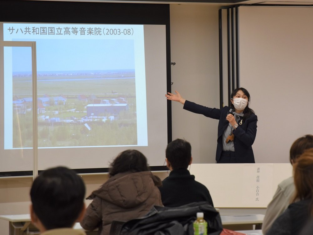 荏原准教授が、実際にサハ共和国に滞在した5年間の経験談や金属口琴「ホムス」の演奏を交えながら、サハの人々の暮らしや文化について解説しました。