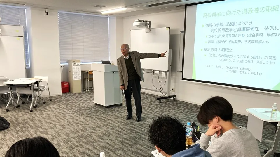 この授業は、少子高齢化社会の中で児童生徒数の減少に伴い、学校の小規模化や統廃合が進んでいることを踏まえ、教職課程を履修している3年生が、北海道の高校の現状や課題を知るとともに、これからの学校、とりわけ高校の役割や在り方を考える契機とすることを目的に実施しました。