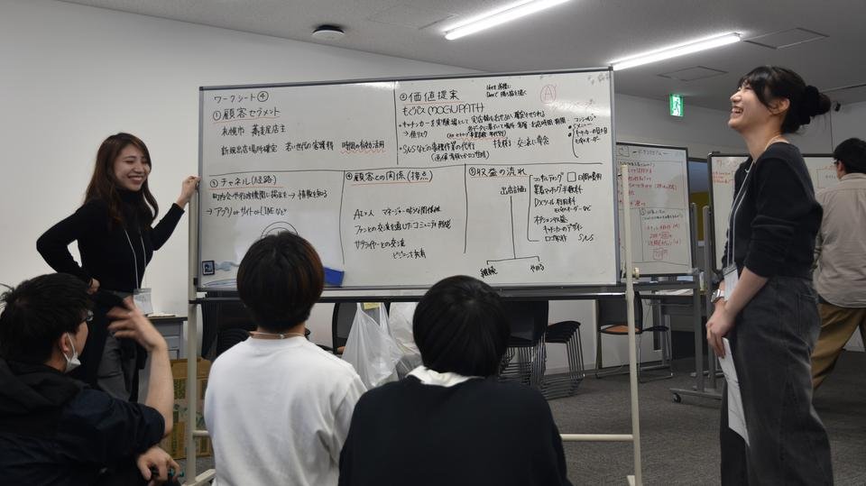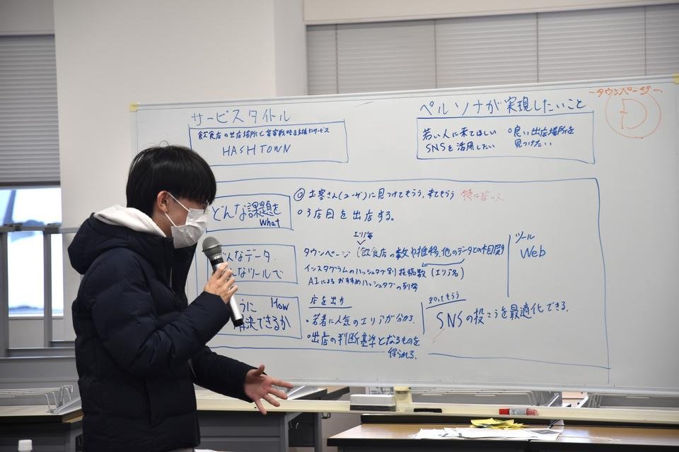 2日目は、Day 1で明確にした課題を解決するための「サービス案」を形にする作業に没頭しました。 単なる「あったらいいな」というアイディアに留まらず、ビジネスプランキャンバスを用いて「どう収益を上げるか」「どうやって顧客に届けるか」というビジネスとしての持続可能性を追求。最終発表では、審査員を前に、各チーム8分間のプレゼンテーションと、質疑応答が繰り広げられました。