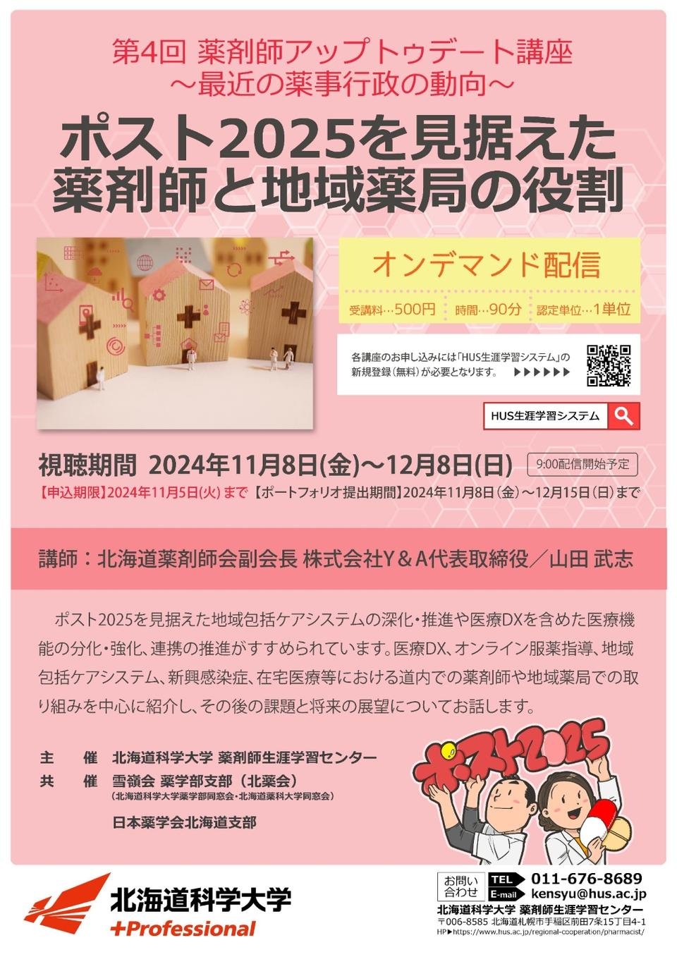 2024年度 北海道科学大学 第4回薬剤師アップトゥデート講座を配信いたします