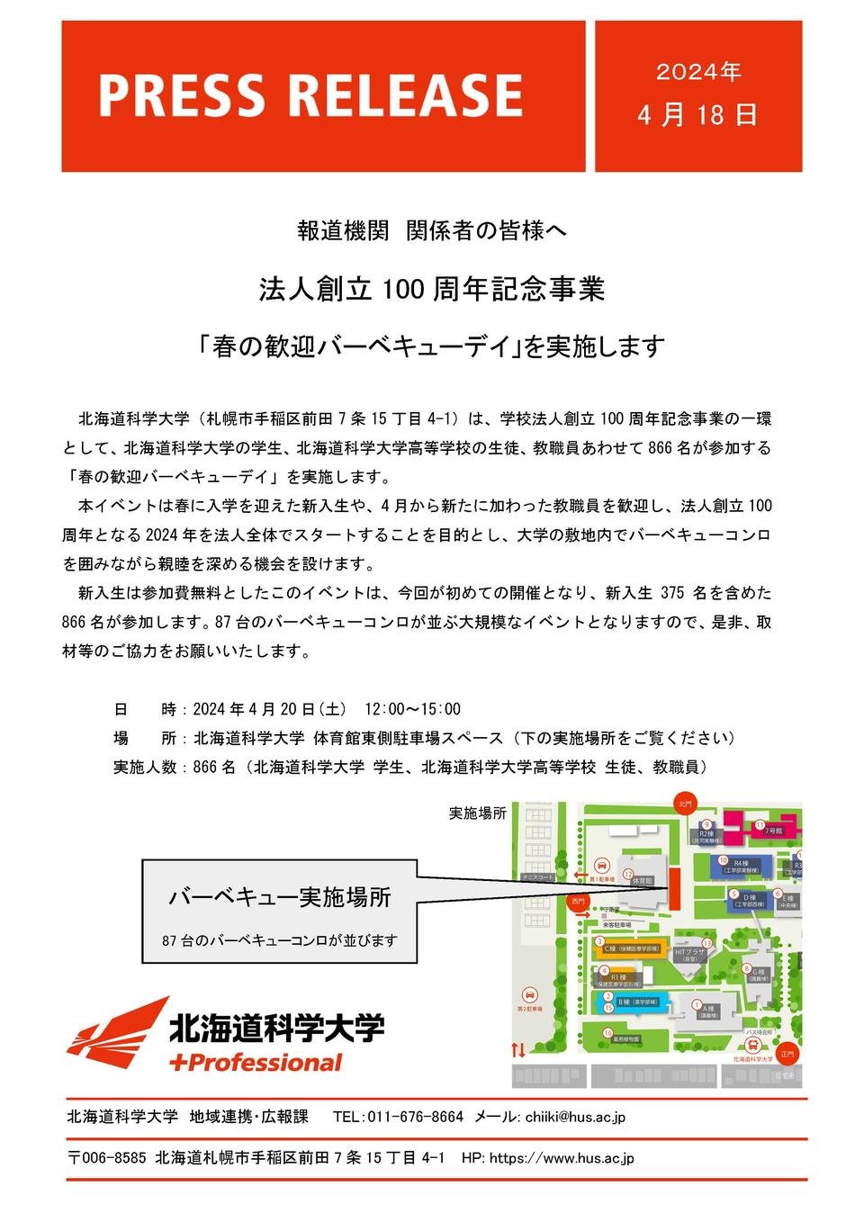 北海道科学大学(札幌市手稲区前田7条15丁目4-1)は、学校法人創立100周年記念事業の一環として、北海道科学大学の学生、北海道科学大学高等学校の生徒、教職員あわせて866名が参加する「春の歓迎バーベキューデイ」を実施します。