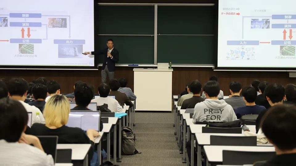 9月27日(金)、機械工学科、電気電子工学科の学生を対象とした特別講演会が、Rapidus株式会社 取締役 専務執行役員・3Dアセンブリ本部長 折井 靖光 氏によって行われました。