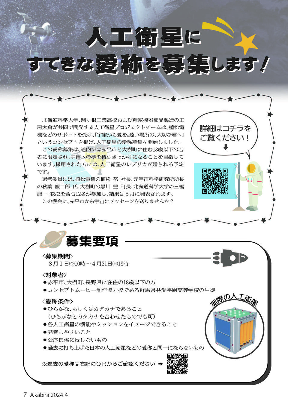 北海道赤平市の広報誌に本学が共同開発する人工衛星の愛称募集について掲載されました