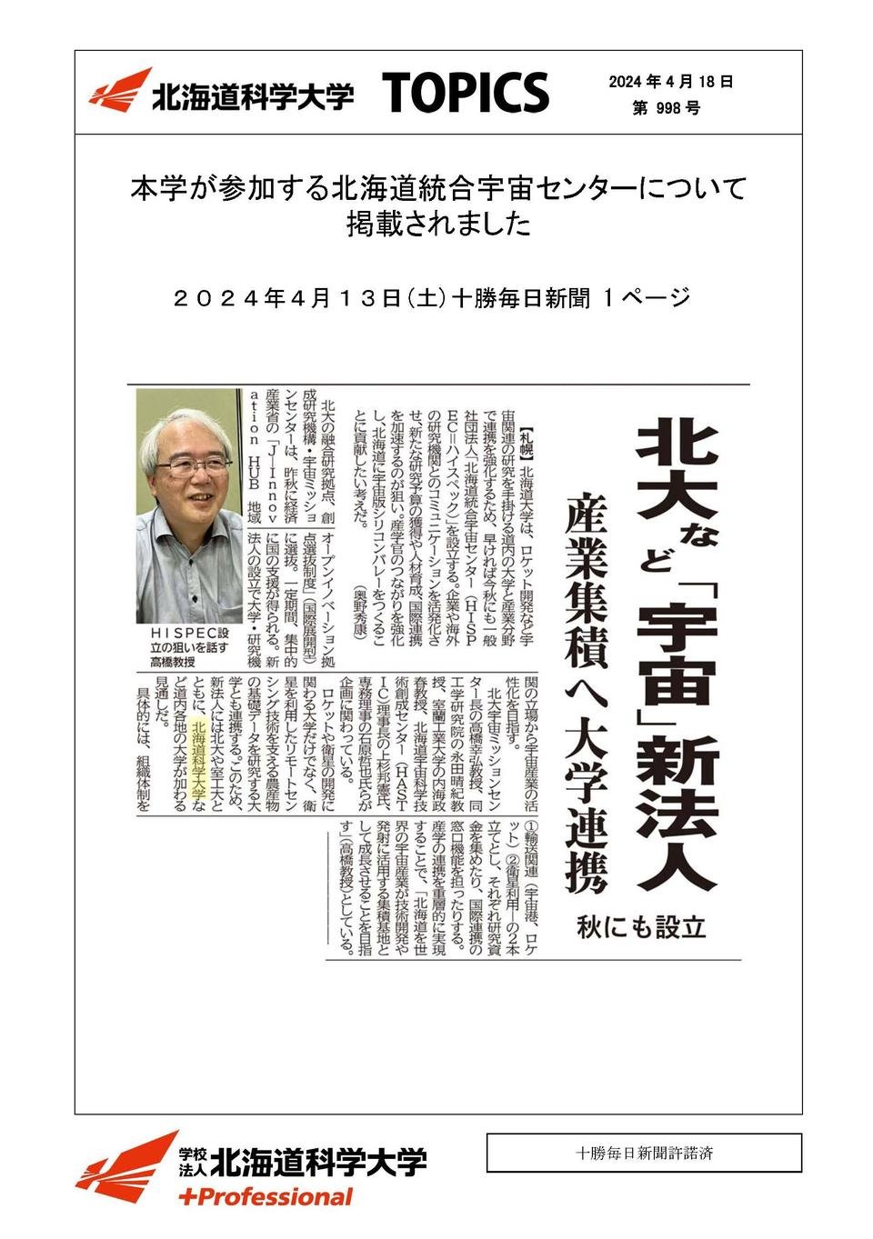 メディア掲載2024年04月19日本学が参加する北海道統合宇宙センターについて掲載されました2024年04月13日十勝毎日新聞北大など「宇宙」新法人記事はこちらこの記事をSNSでシェアXでシェアするLINEでシェアする