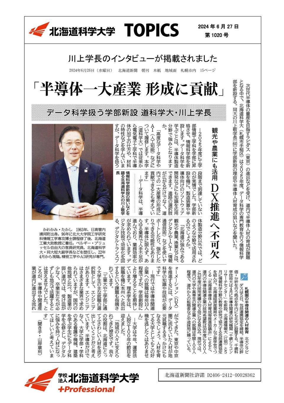 メディア掲載2024年06月27日川上学長のインタビューが新聞に掲載されました2024年06月26日北海道新聞川上 敬 学長半導体一大産業 形成に貢献(15面)記事はこちらこの記事をSNSでシェアXでシェアするLINEでシェアする