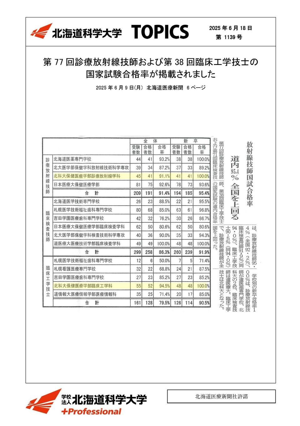 メディア掲載2025年06月18日第77回診療放射線技師および第38回臨床工学技士の国家試験合格率が掲載されました2025年06月09日北海道医療新聞放射線技師国試合格率 道内95.4%全国を上回る (6ページ)記事はこちらこの記事をSNSでシェアXでシェアするLINEでシェアする