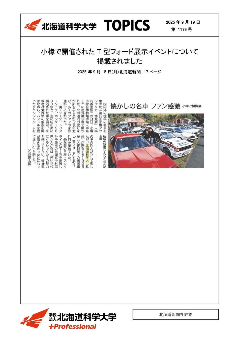 メディア掲載2025年09月19日小樽市で開催されたT型フォード展示イベントについて掲載されました(北海道新聞 2025年9月15日)北海道新聞 2025年9月15日記事はこちら この記事をSNSでシェアXでシェアするLINEでシェアする