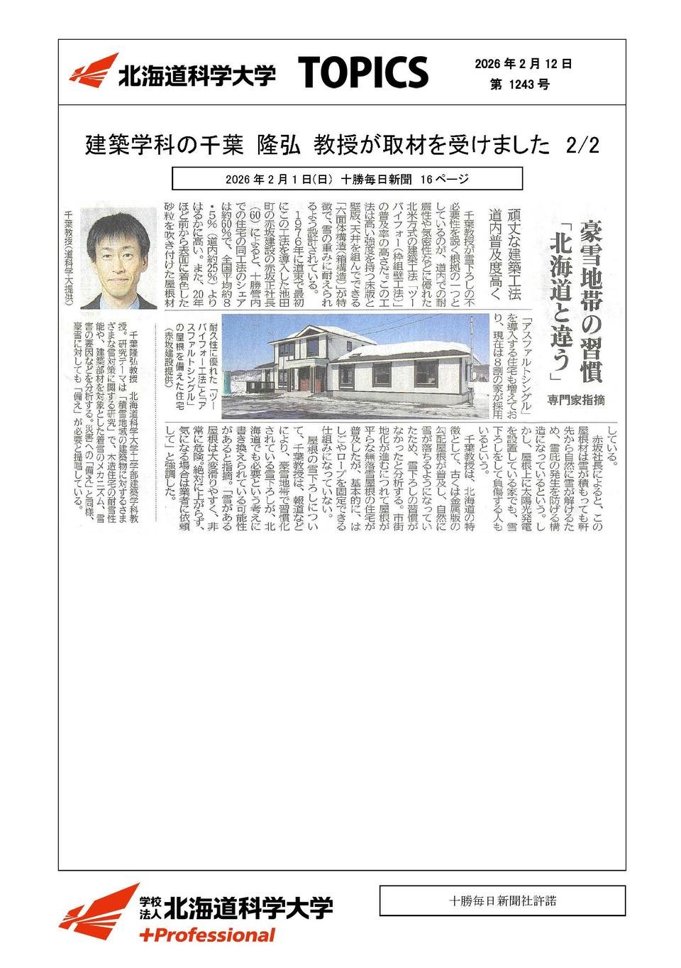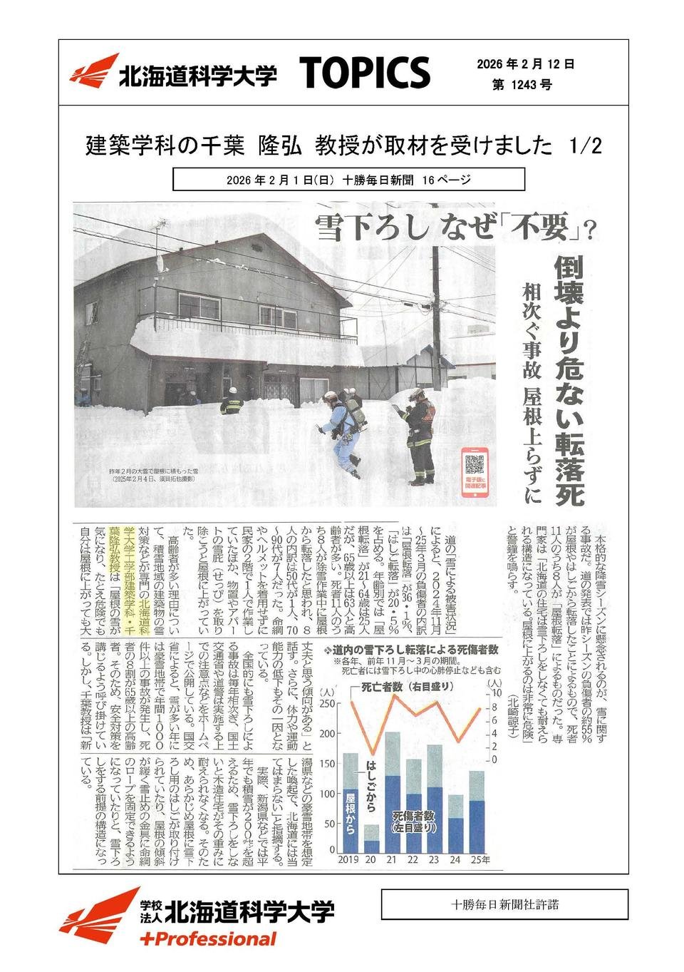 工学部メディア掲載教員・研究2026年02月12日建築学科の千葉 隆弘 教授が取材を受けました雪下ろしなぜ「不要」? 転倒より危ない転落死(16面)記事はこちら (1/2)記事はこちら (2/2)この記事をSNSでシェアXでシェアするLINEでシェアする