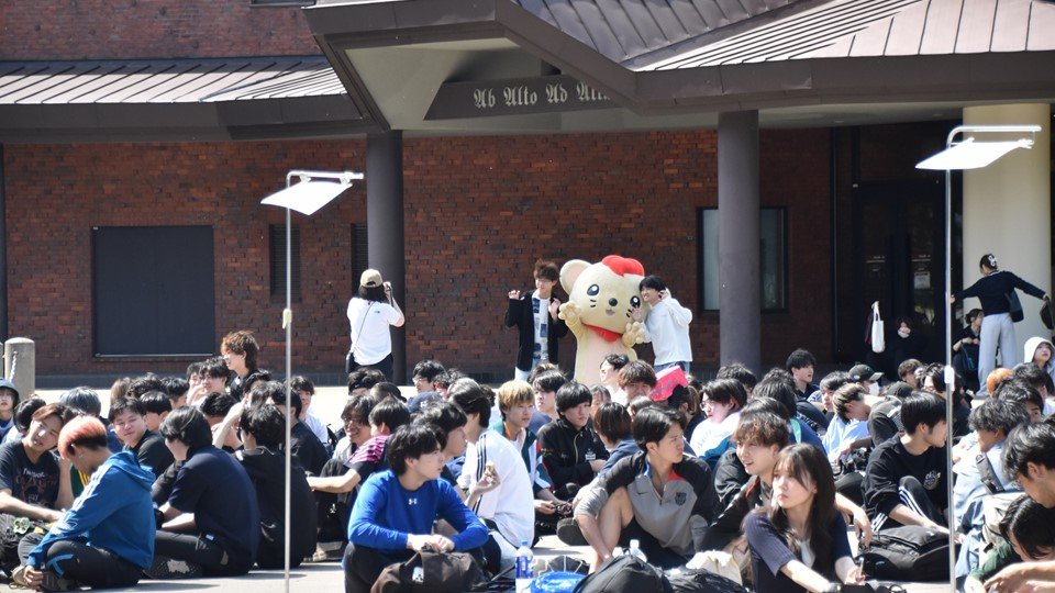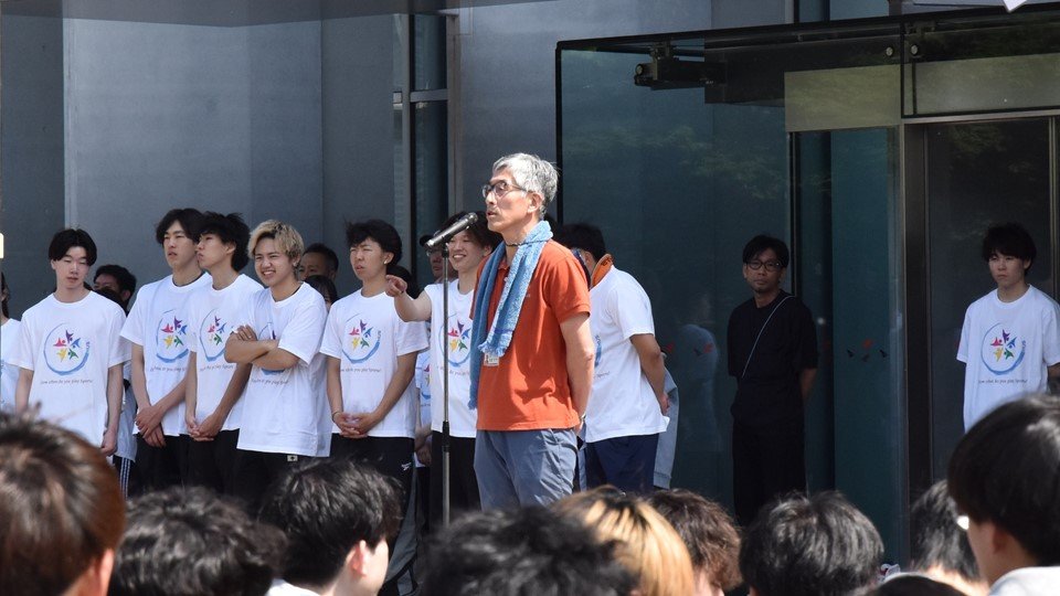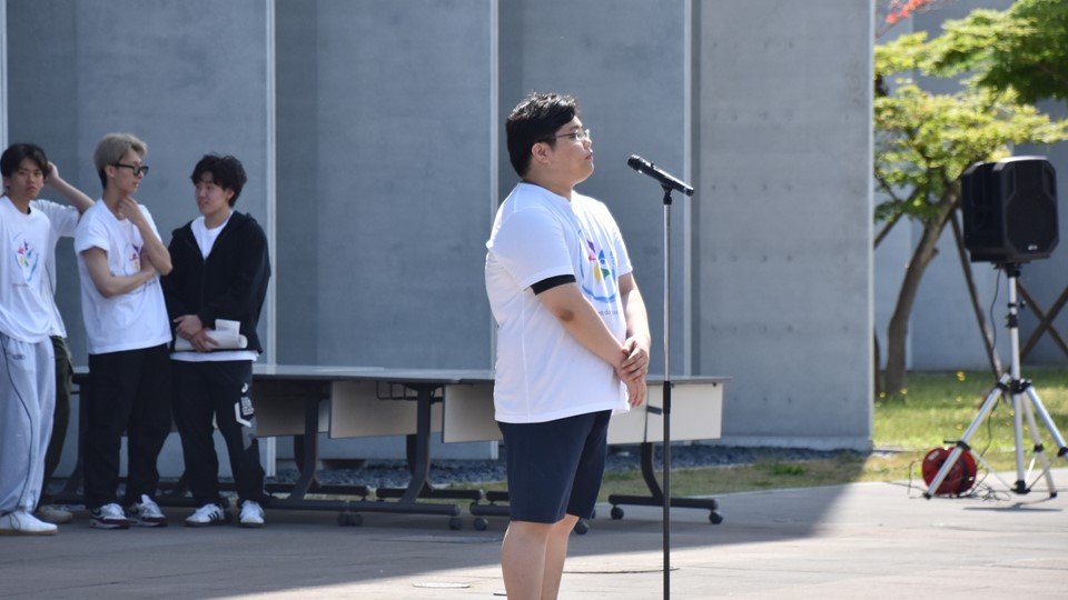E棟前で行った開会式では、体育局長 中野 遥斗さんと学生支援センター長 佐藤 隆司 先生からの挨拶のほかに、注意事項の説明が行われました。