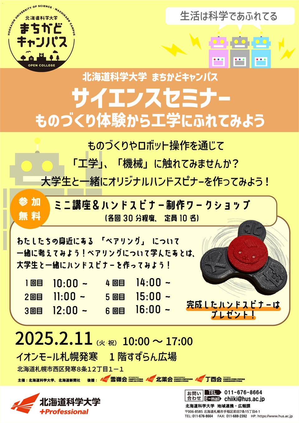 2月11日(火・祝)イオンモール札幌発寒で、まちかどキャンパス「サイエンスセミナー ものづくり体験から工学にふれてみよう」を開催します